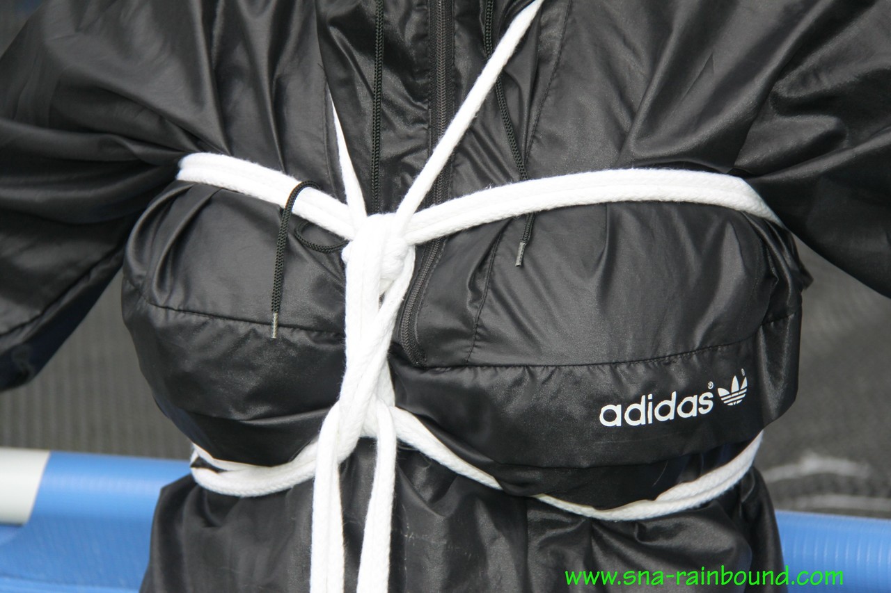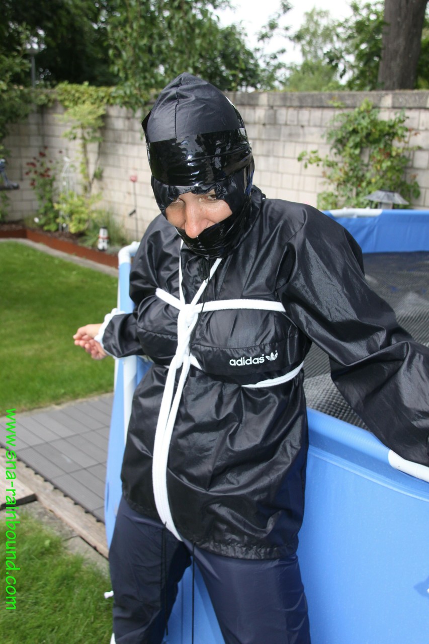 سандرا الهواية خنقة، مقيدة إلى حمام السباحة في معطف المطر - بونديج BDSM في الهواء الطلق، مثير ملابس، مقطع قريب من التوتر الهواية تحت الشمس.