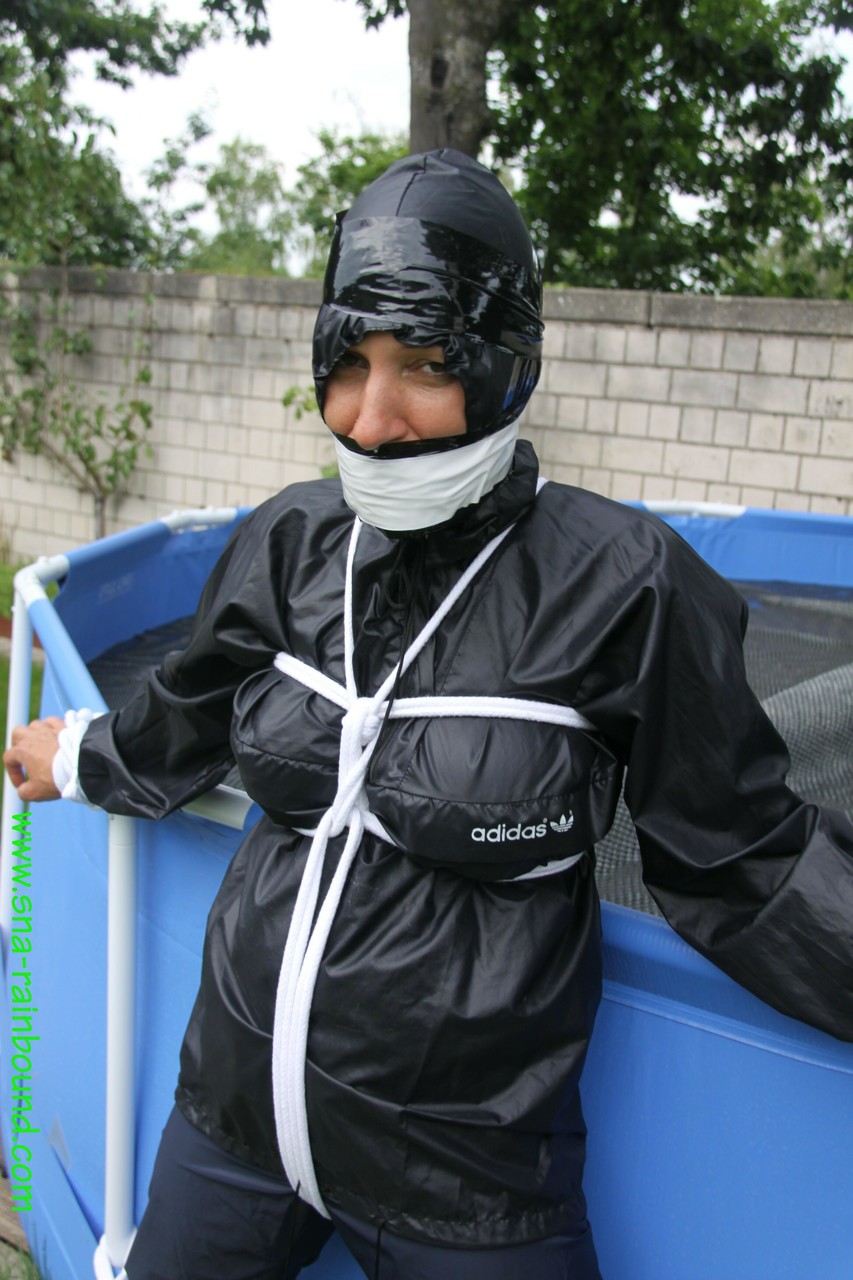 امرأة هاوية ساندرا مكممة ومربوطة إلى حمام السباحة بالمعطف المطري
