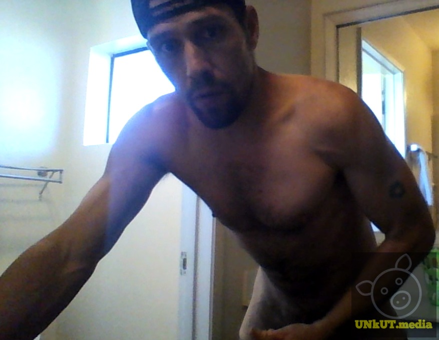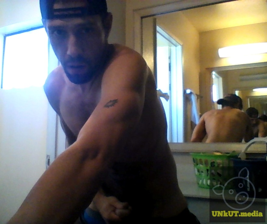 وسيم مثلِّج عضلي يعجب بانعكاسه الشعر في المرآة بينما يحكّ قضيبه الكبير غير المختون، يقترب من هزة قوية.