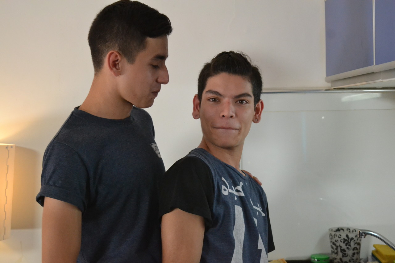 شاب قصير الشعر بني المظهر مخدر وجنسي من قبل رفيق الغرفة في المطبخ
