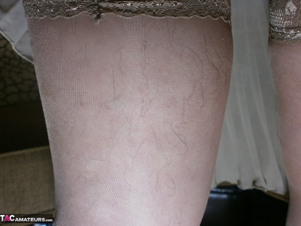 عازفة الهواية كارو تبرز ساقيها و إبطيها غير المحدودة بينما تُظهر بعضاً من فرجها الشعرية الناضجة في جوارب أوروبية و كعب عالي.