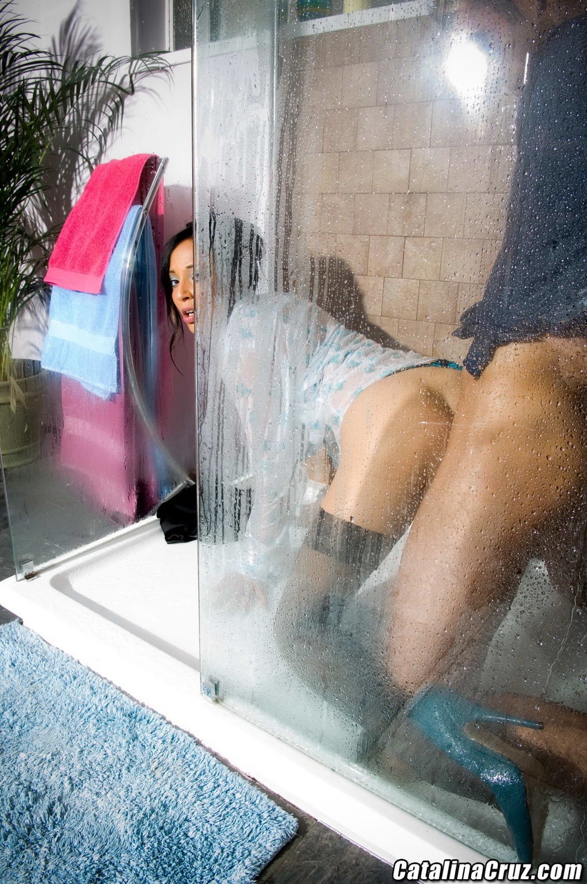 نجمة الإباحية ذات الشعر الأسود رومانا رايدر تمارس الجنس في الدش، تتناك من الخلف، يقذف على صدرها وجواربها في خيال مثير بالملابس الداخلية.