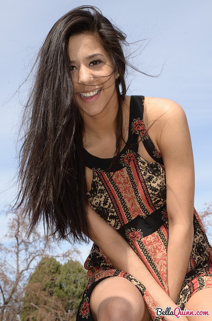 اللماتينية الجميلة بيلا كوين تُظهر ساقيها العاريتين في فستان مفتوح الجانب - معلومات المعرض