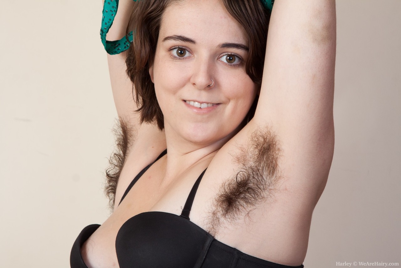 سيدة متفرعة شعرها غامقة هارلي تبرز ساقين شعرية، إبطين مشعرة وفرج شعر - معلومات المعرض