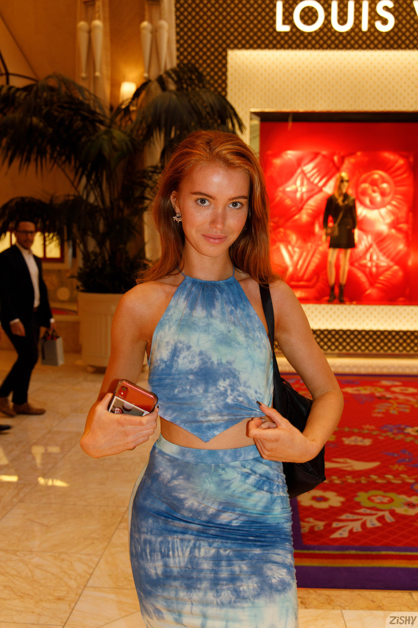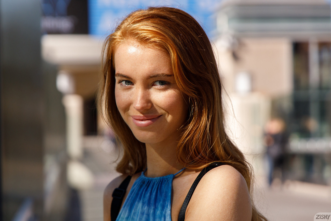 الهواة الحمراء الجميلة زوي لونا تغازل بدون ملابس داخلية تحت فستان ضيق في أوضاع عامة جريئة، تُظهر جمالها الأحمر الشاحب ومنحنياتها المنفردة الرائعة في الهواء الطلق.