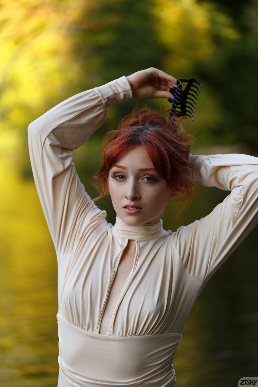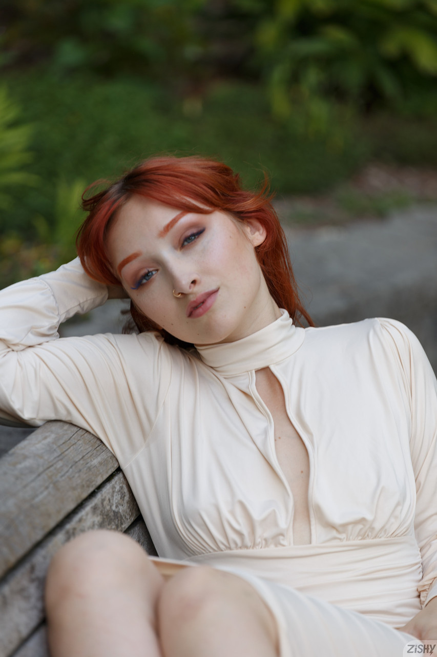 المراهقة الحمراء الأنيقة نوير تراود في فستان فخم، تُبرز جسدها الممتلئ وسحرها الأحمر في معرض منفرد هواة. الجميلة البيضاء تأسر بالأناقة غير العارية.