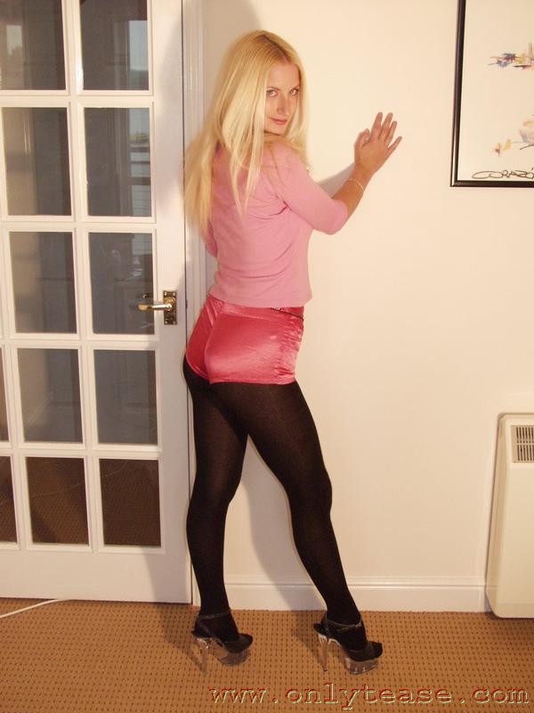 العاشقة البريطانية الشقراء نيكي نو تغازل في جوارب طويلة وشورت، تُظهر ساقيها الطويلتين ومنحنياتها المثالية في معرض استriptiz منفرد.