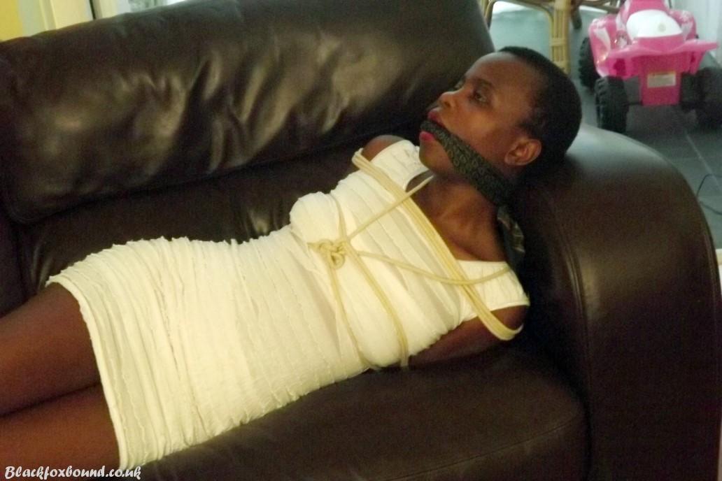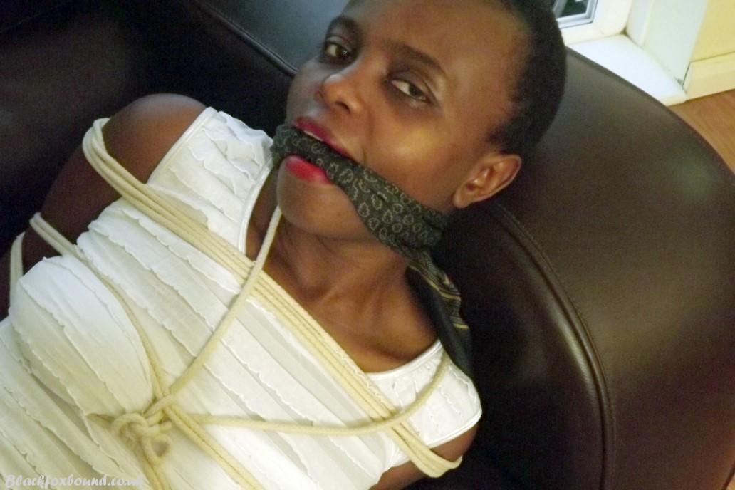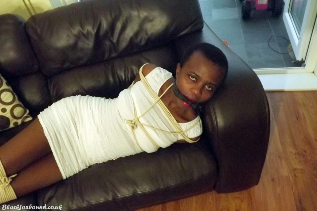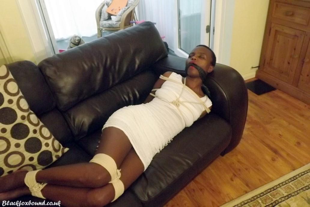 امرأة سوداء مربوطة ومكممة بمنديل في فستان أبيض على أريكة جلدية - معلومات المعرض