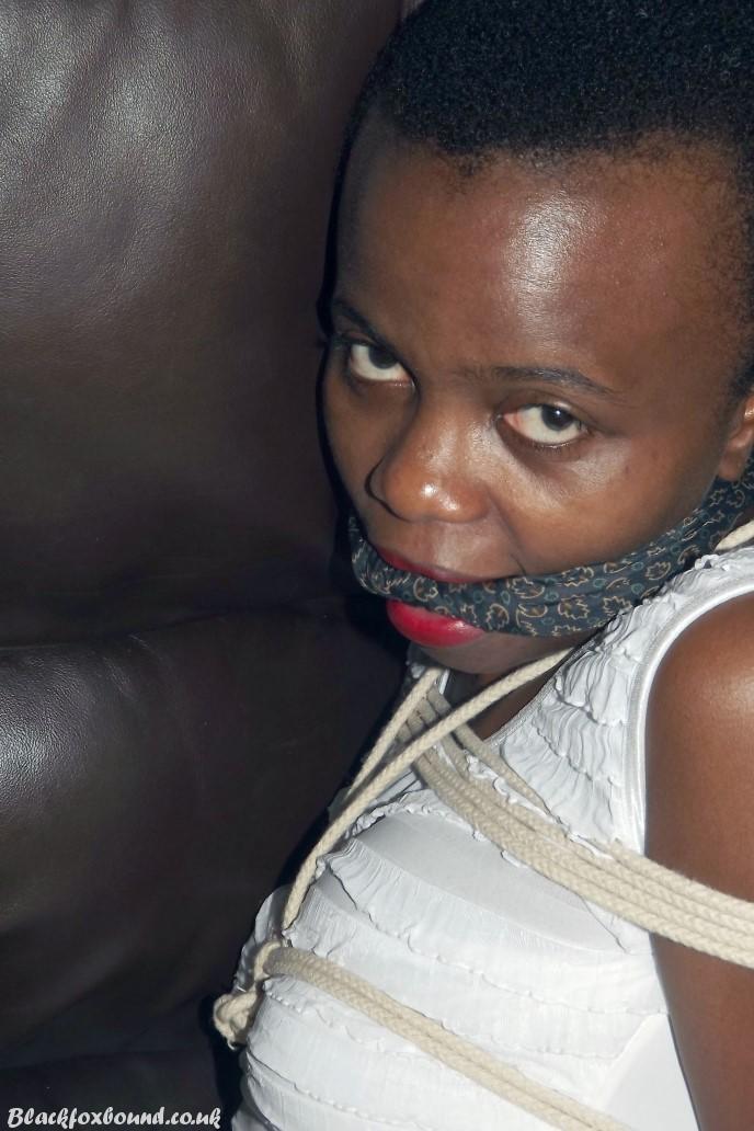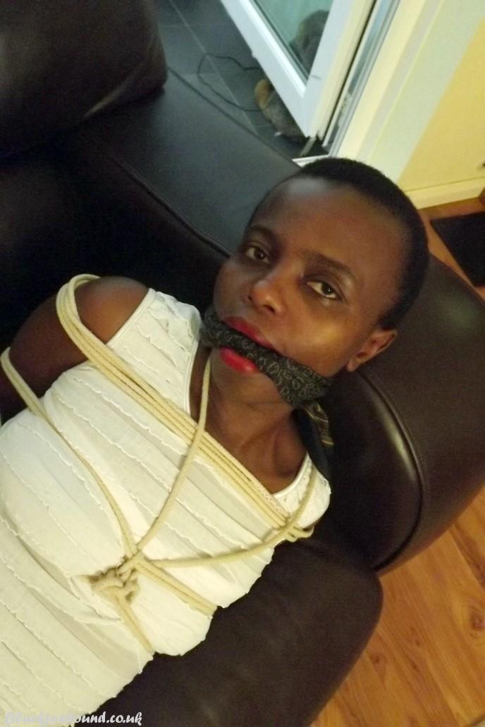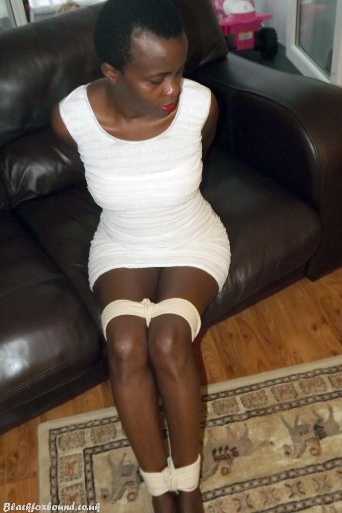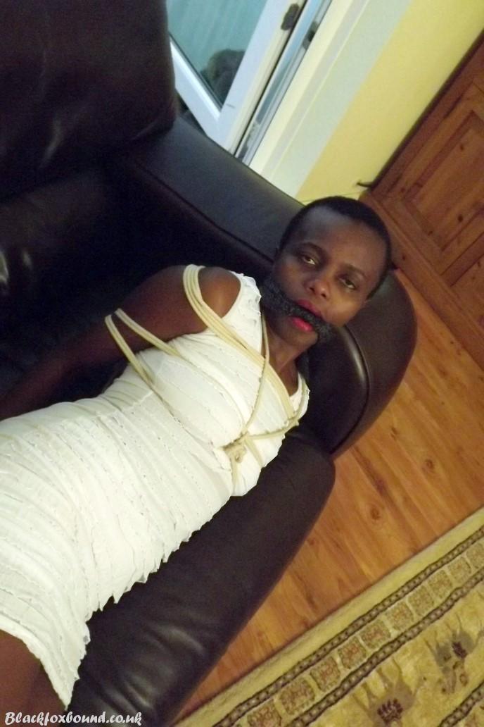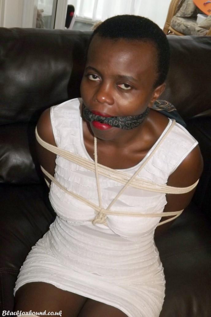 امرأة سوداء مربوطة ومكممة بمنديل في فستان أبيض على أريكة جلدية - معلومات المعرض