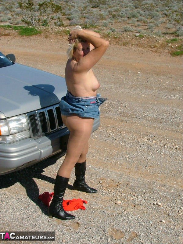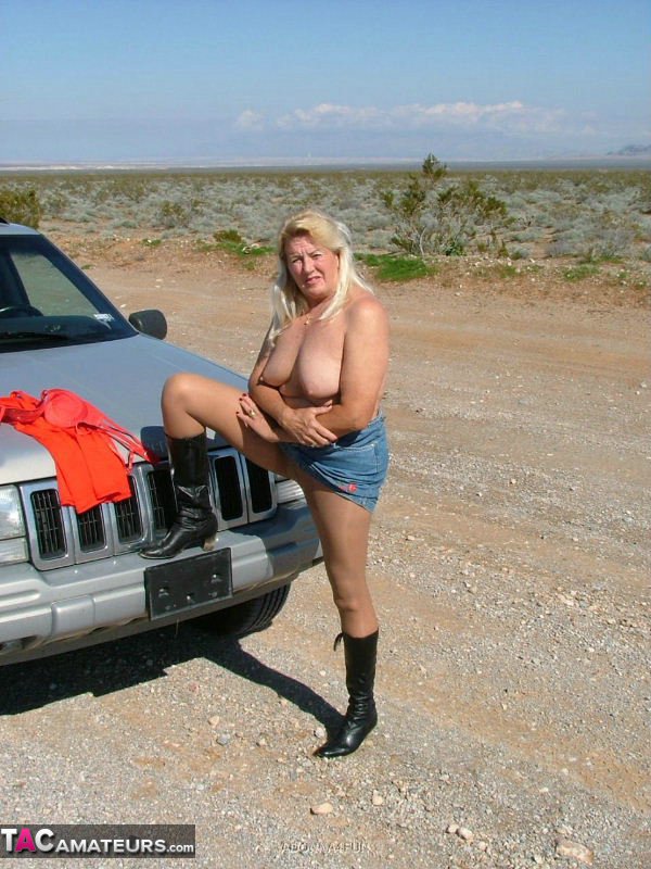 البلonde الناضجة أدونا تكشف عن صدر كبير في انابيب في الهواء الطلق - معلومات المعرض