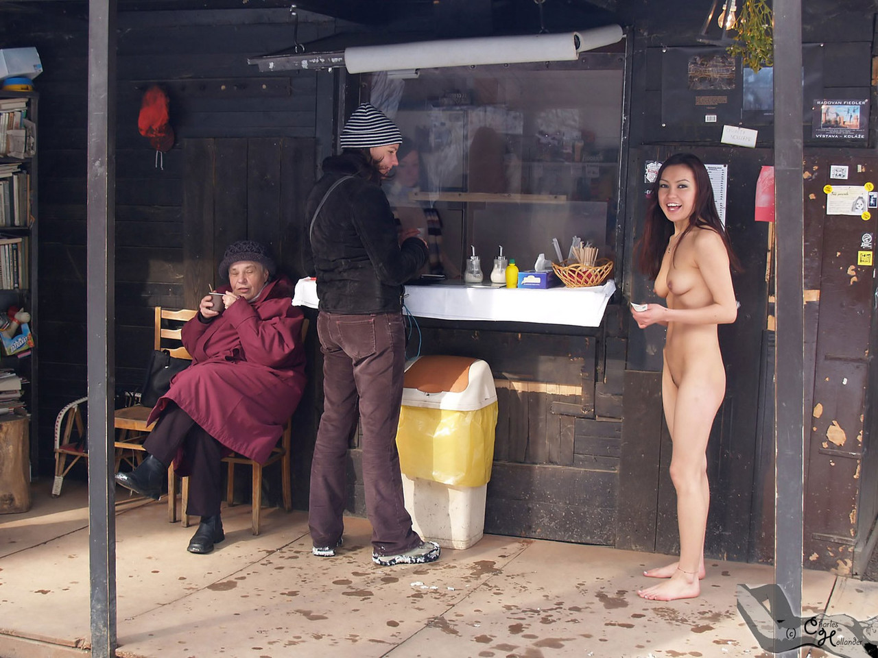 فتاة نحيلة عارية تمشي وتُرقص وتُدخل الدراجة في الأماكن العامة - معلومات المعرض