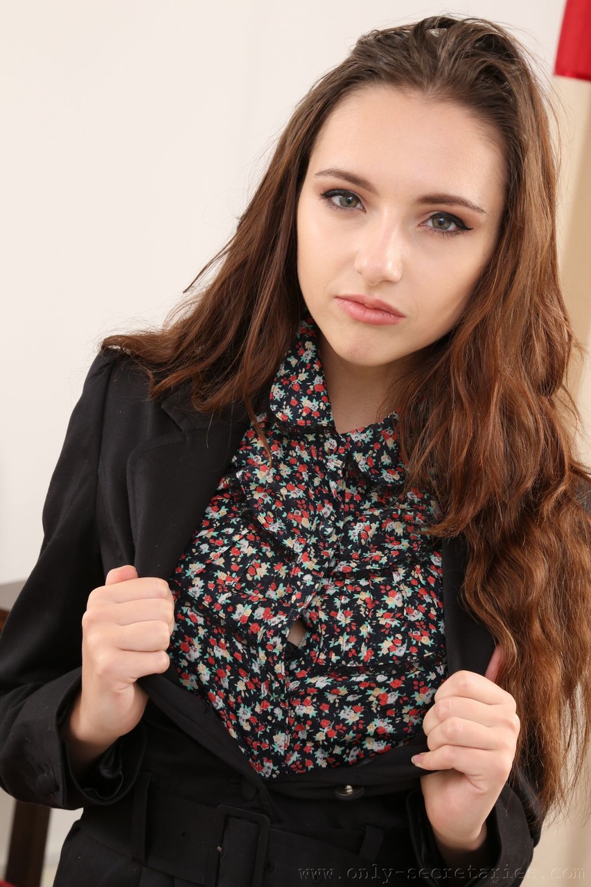المراهقة البريطانية ذات الشعر البني صوفيا بلاك تخلع زي السكرتارية وتفتح رجليها بالجوارب والتنورة والملابس الداخلية، تُظهر بزازها في المكتب.