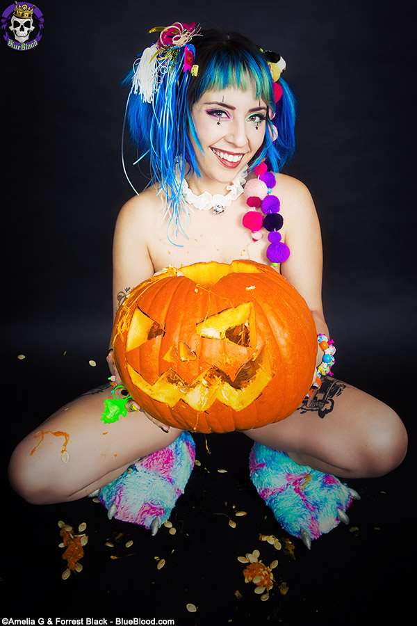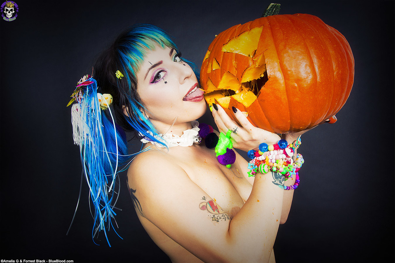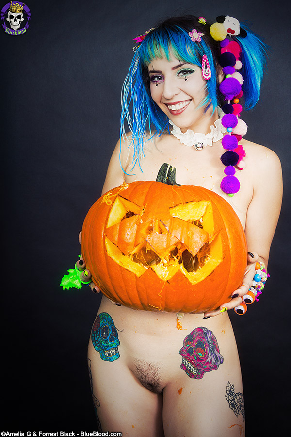 فتاة غوث لطيفة لوم تتعري أثناء نحت قرعة الهالوين - معلومات المعرض