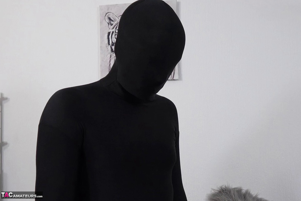 امرأة ناضجة بدينة تمارس الجنس مع رجل مغطى بالكامل