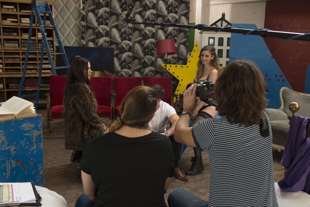 الفتيات الهواة المؤدلات يصبحن متحمسات وشقاوات أثناء جلسة التصوير - معلومات المعرض