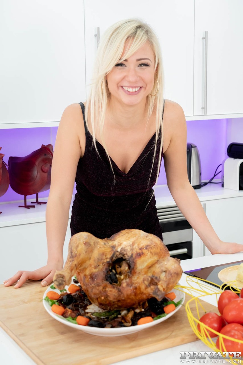 الغامضة الشقراء جابي جولد تلاعب مع حماها في تنورة قصيرة وحذاء عالي الكعب، وتعرض صدرها الطبيعي الكبير وبظرها المحلوق في لقاء حار في المطبخ.