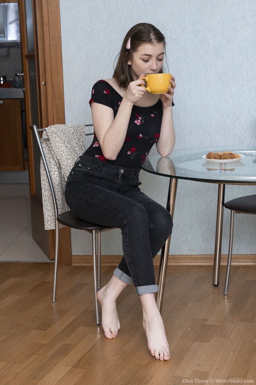 Hairy teen Eliza Thorn flaunts her bushy armpits and cute amateur pussy in a hot solo spreading scene, showing off every inch of her natural brunette teen body.