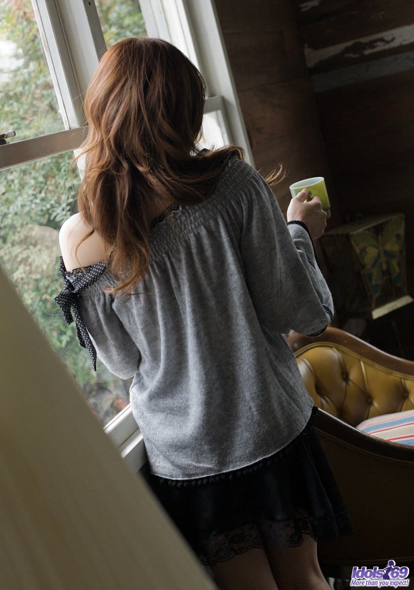 Watch Japanese babe Emi Harukaze sip a hot drink, strip from jeans and lingerie, flash tiny natural tits, erect nipples and tight ass in steamy solo tease.