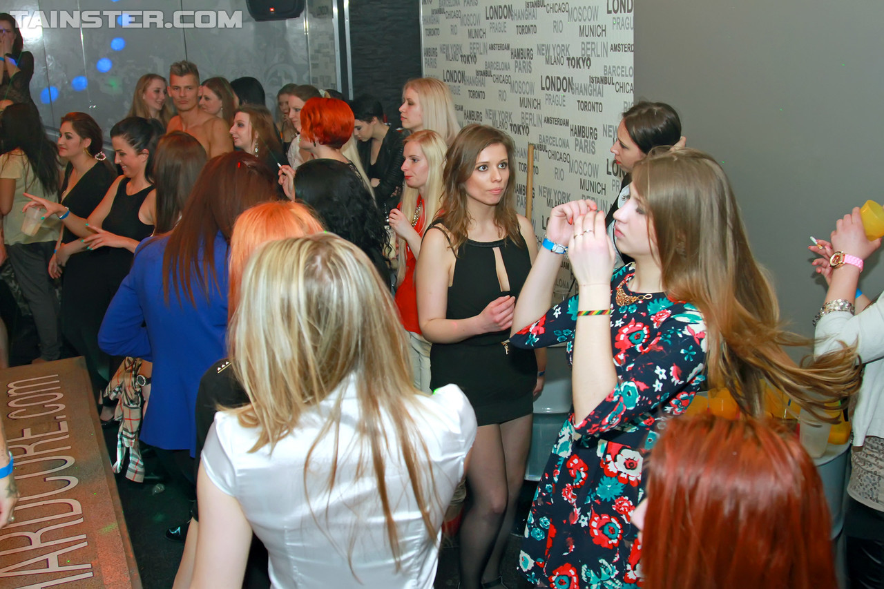 Drunk Euro party girls in CFNM orgy sucking stripper cock, getting ass-fucked in stockings and shorts before wild group cum finale