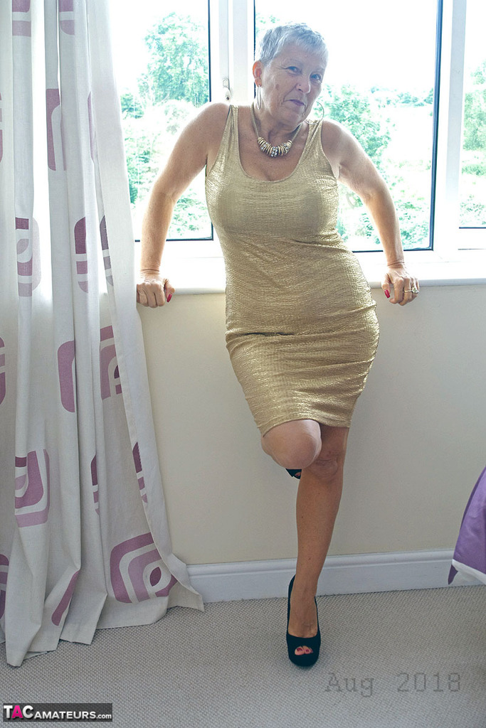 Hot blonde granny Savana, 70+, teases in skirt and heels, stripping to show shaved pussy and big ass spread for amateur grandma lovers.