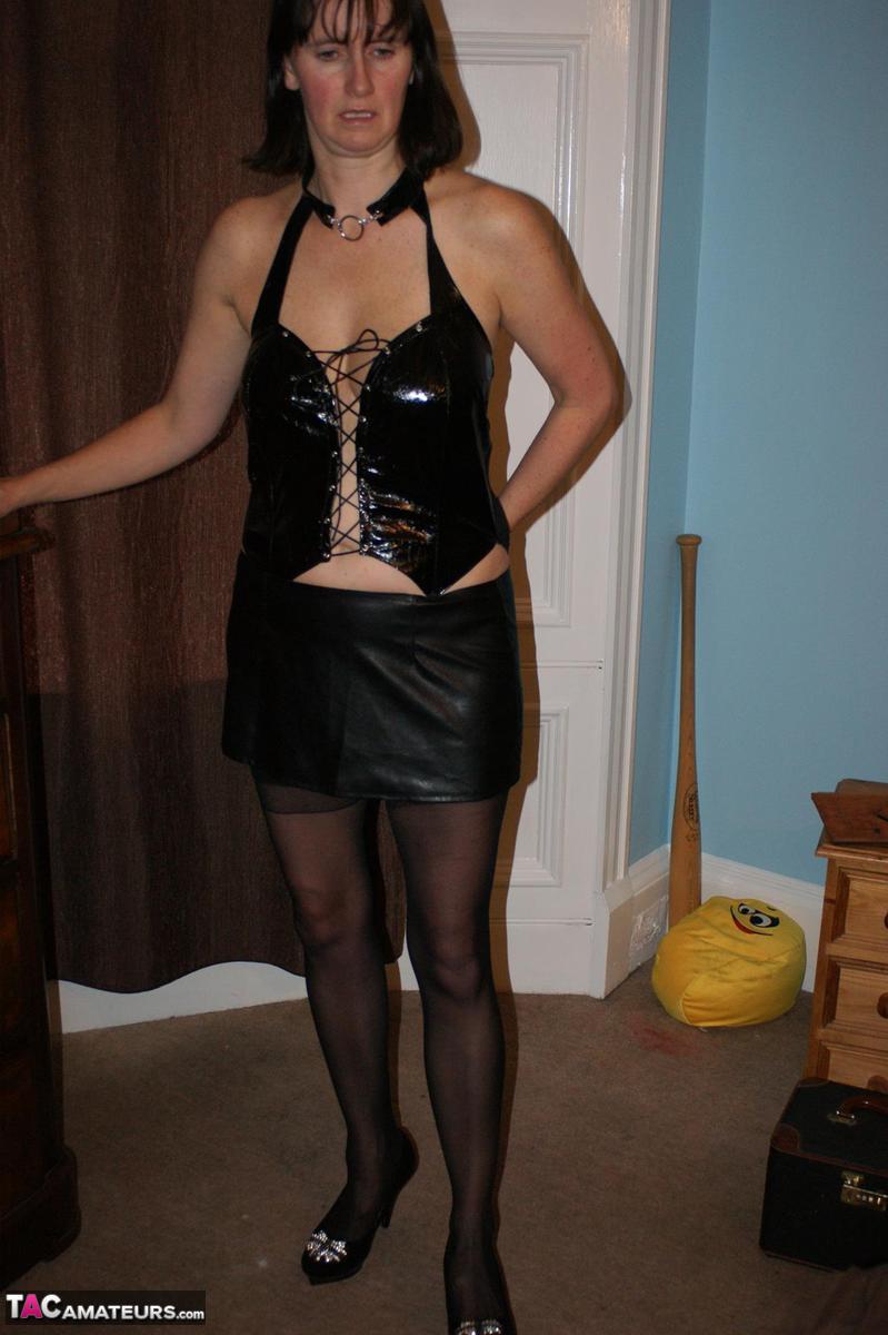 Scot Susan, a sultry older amateur slut in latex and lingerie, teases her hairy mature pussy before dropping to her knees for a steamy, skilled blowjob.