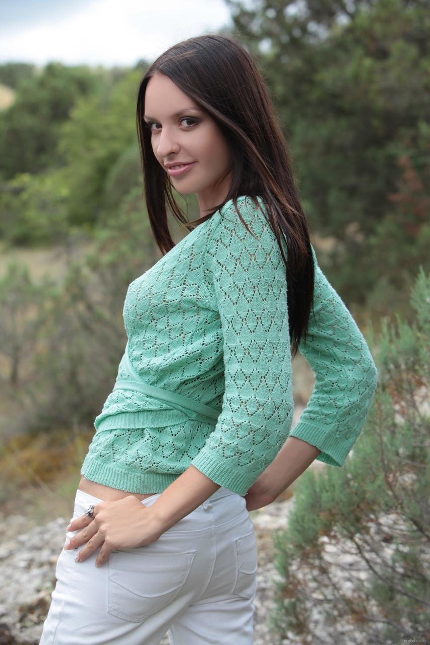 Nika E unveils her petite teen perfection outdoors, slipping off her jeans to reveal tiny A-cup tits, big pussy lips and tight asshole spread wide under the sun.