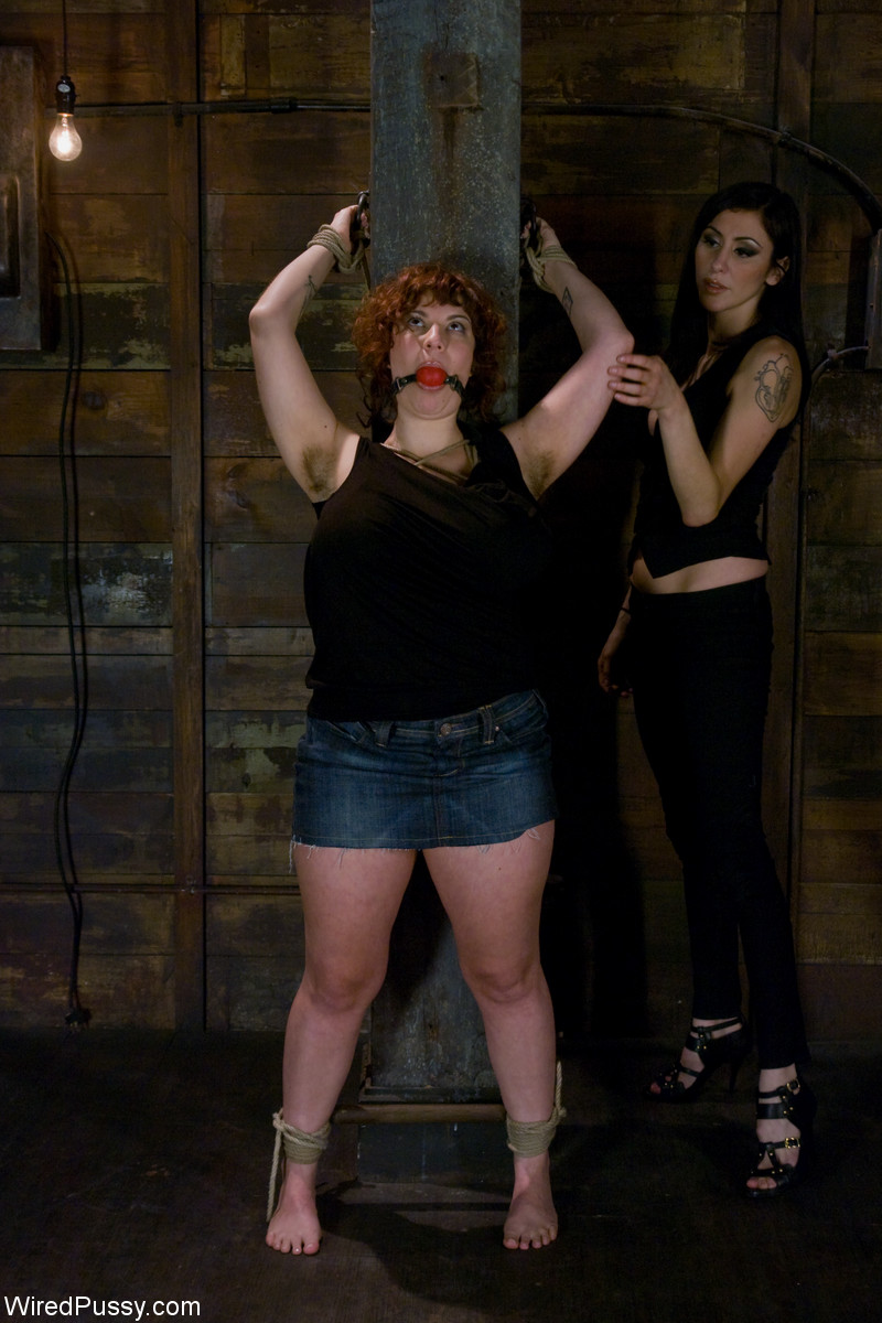 Curvy redhead Mariah Cherry submits to Princess Donna Dolore in wired pussy BDSM, BBW bondage, big natural tits tormented