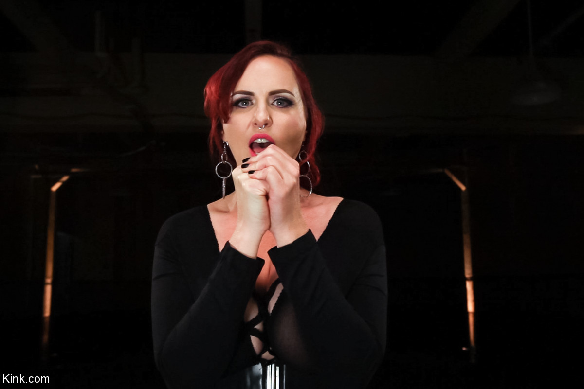 Fiery natural redhead MILF Mz Berlin teases in BDSM bondage gear, flashing her big hooters after a quick twat stroke session.