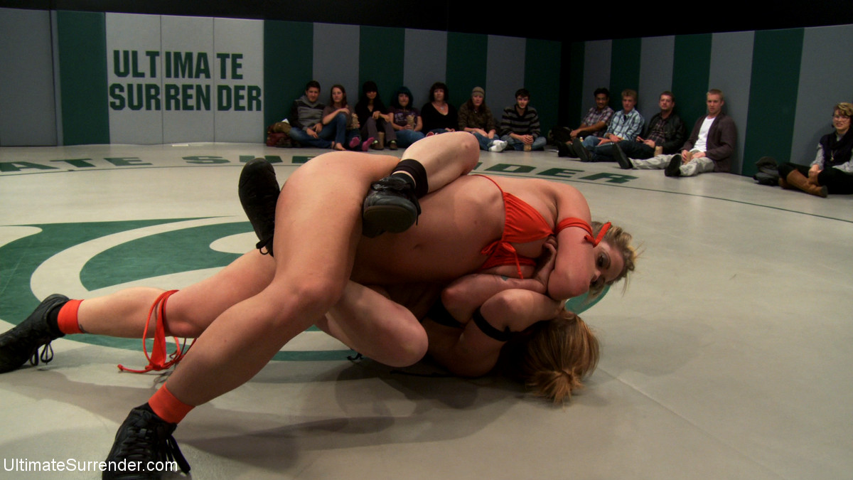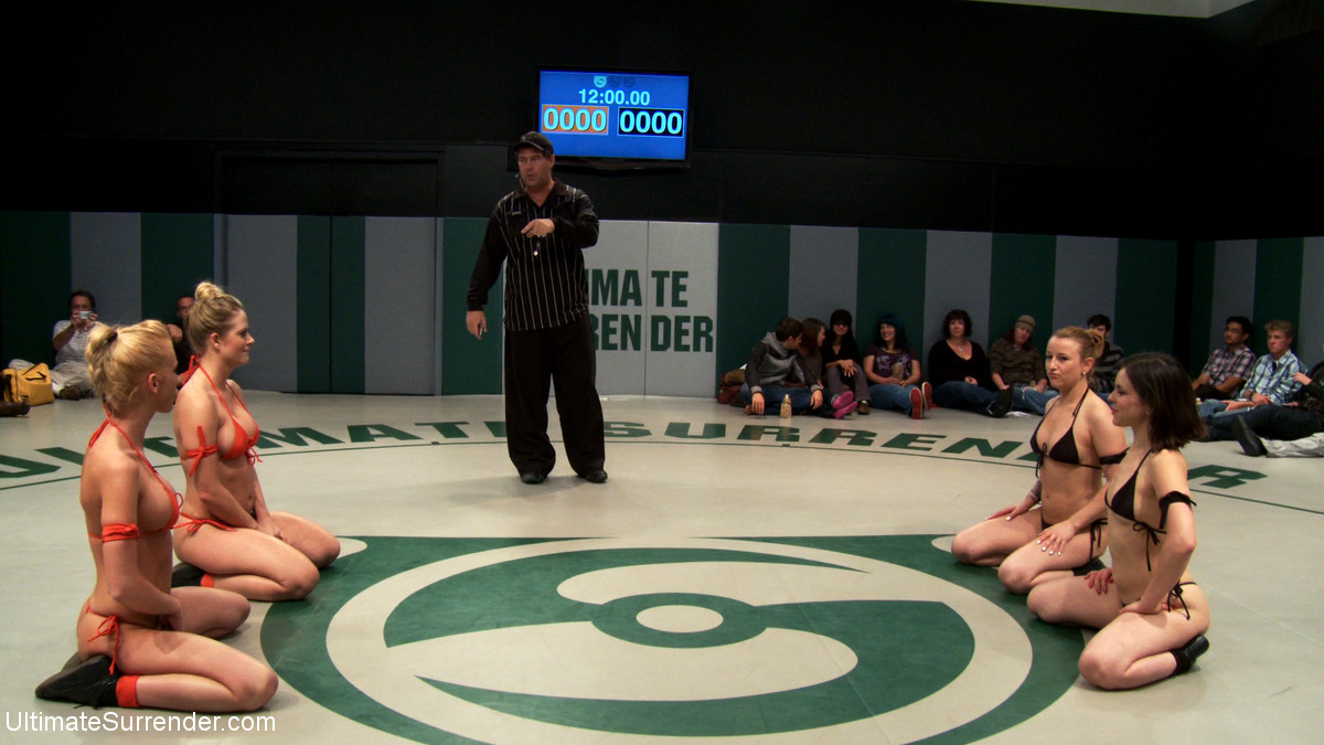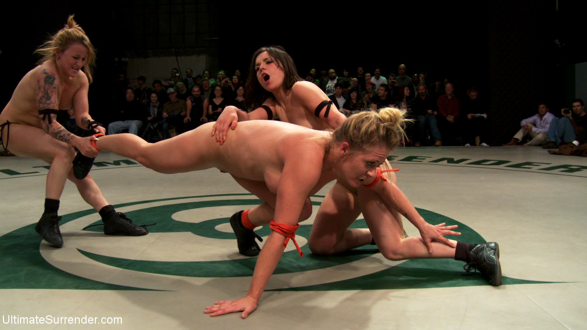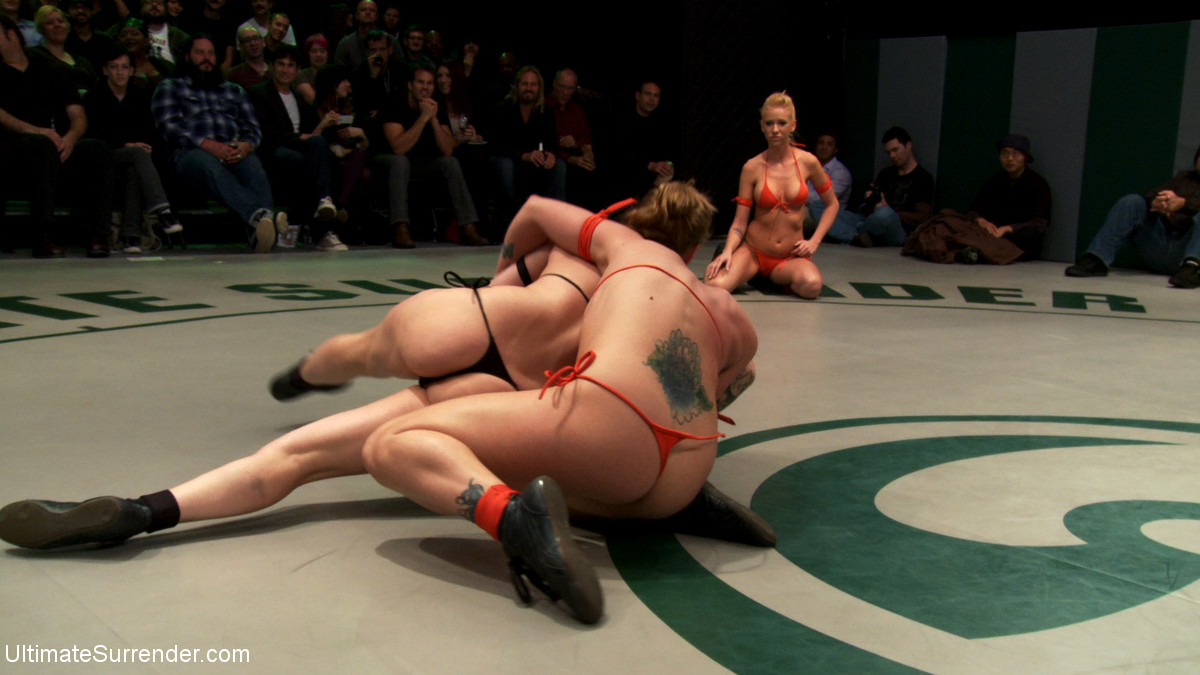 Ultimate Surrender lesbian BDSM photos: tall blonde Holly Heart, brunette Isis Love & petite Jessie Cox battle in bikinis, bondage holds, erotic domination and submission sports action