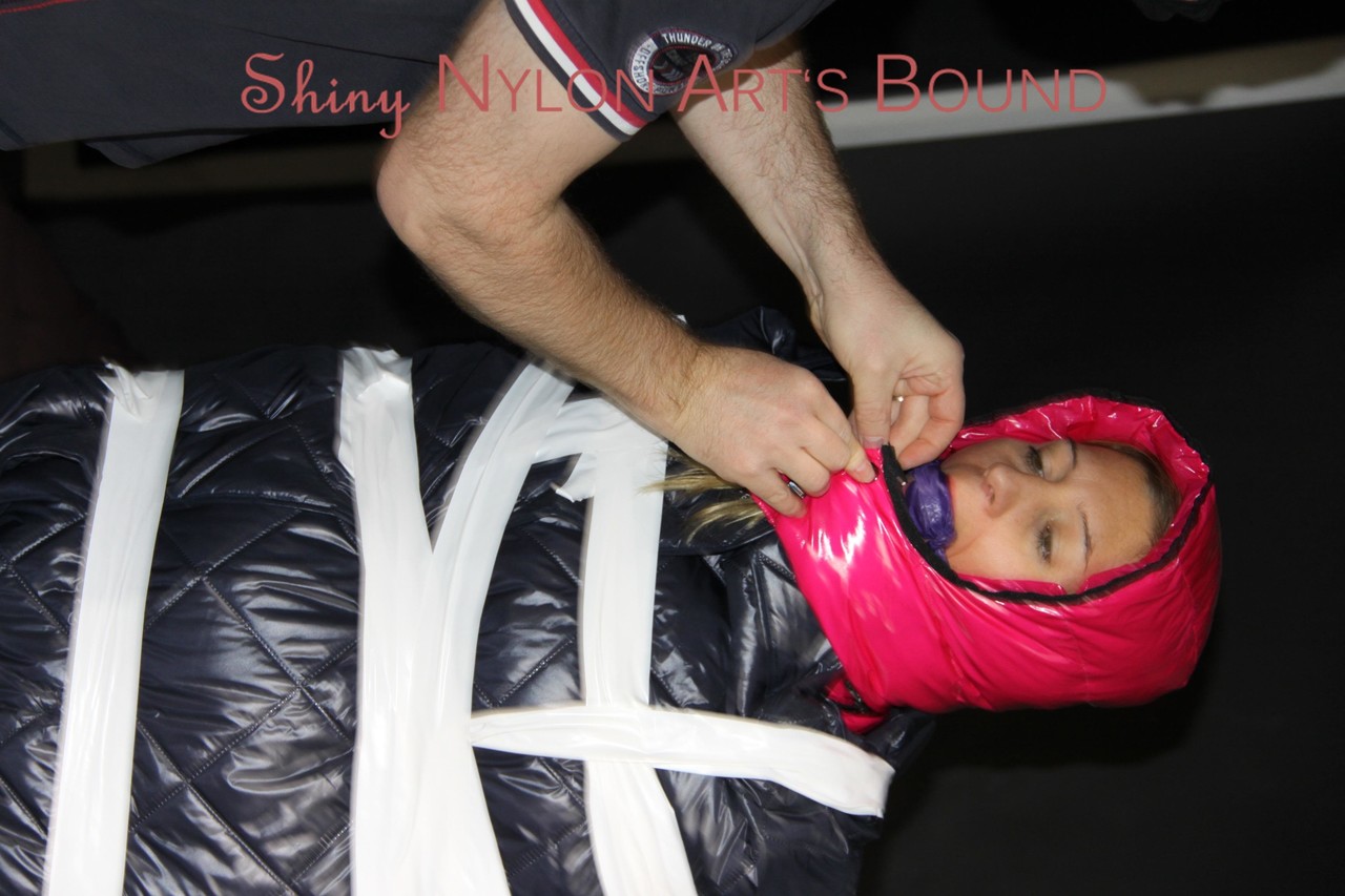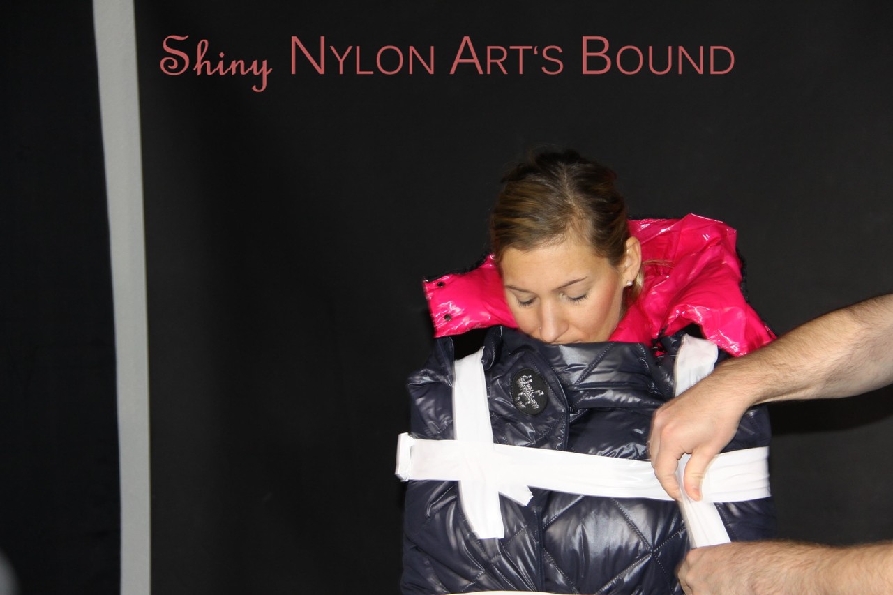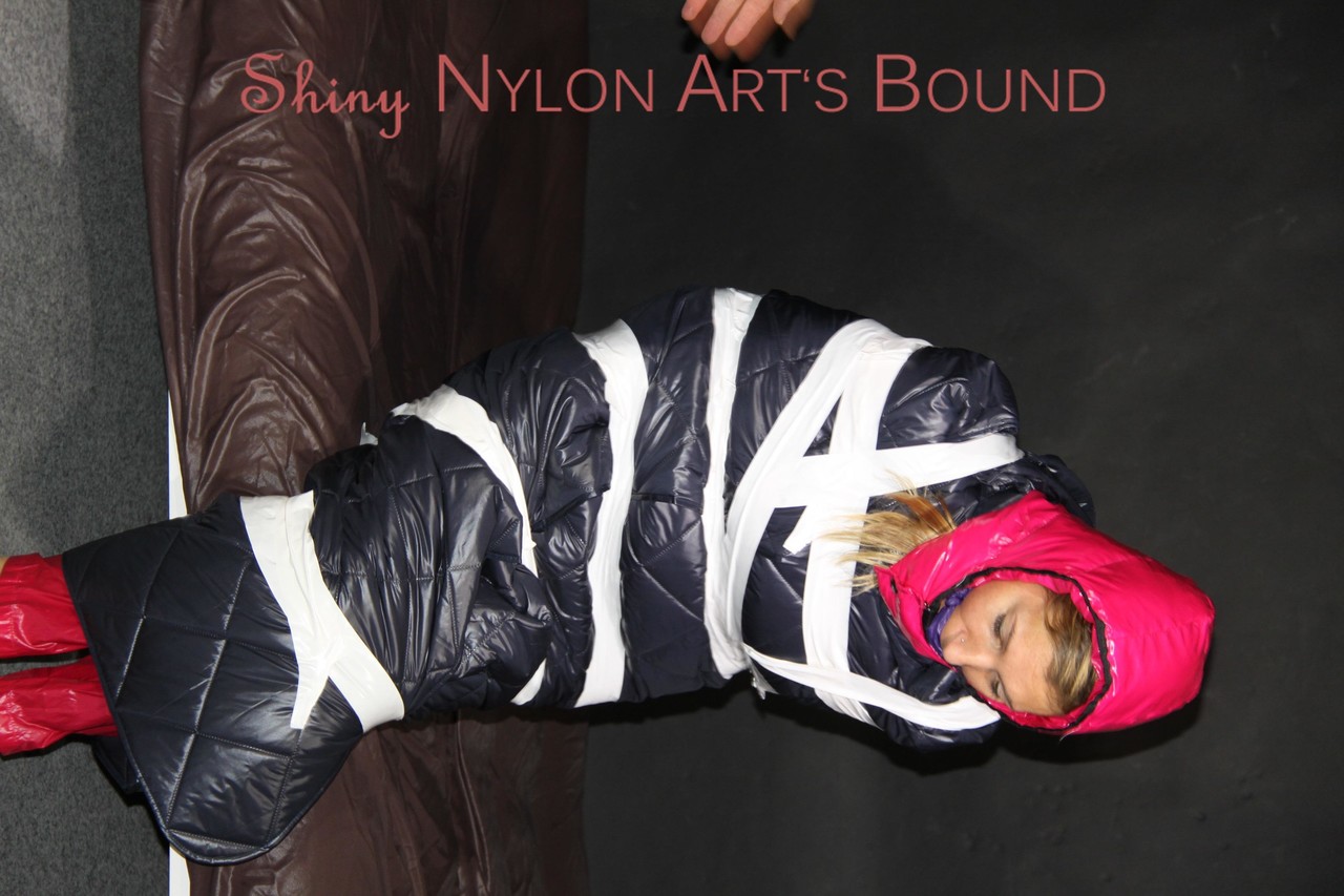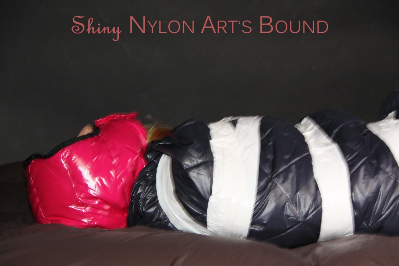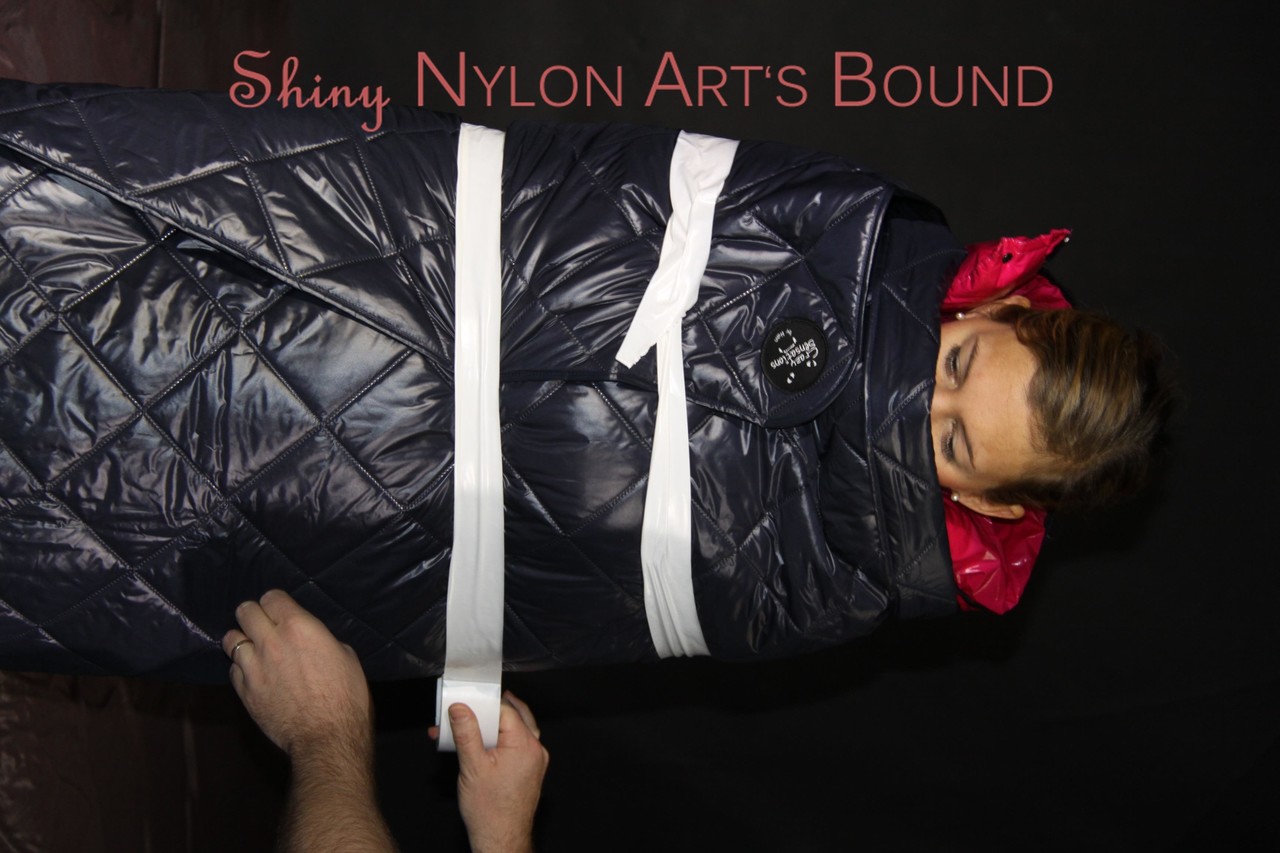 Home BDSM White Girl Bound In Down Cover And Nylon Jacket