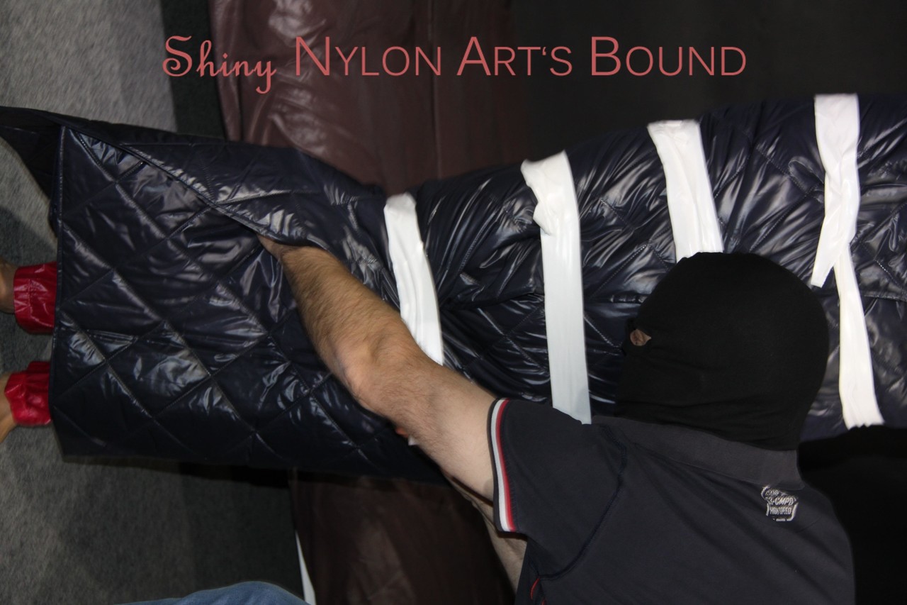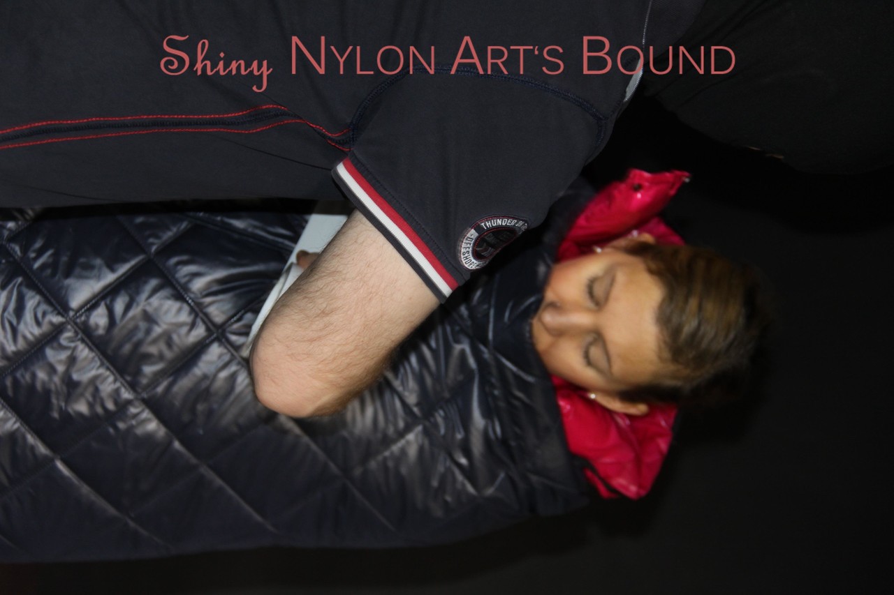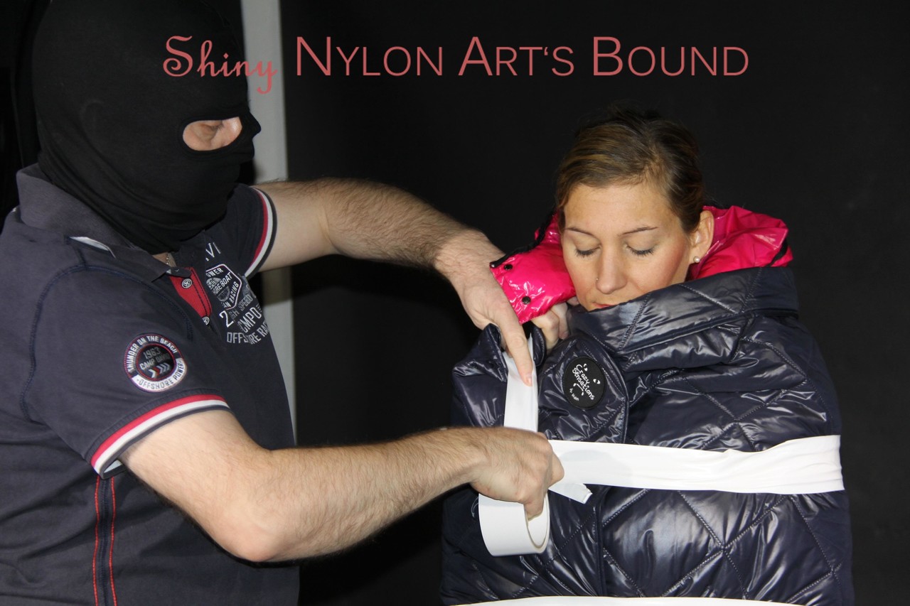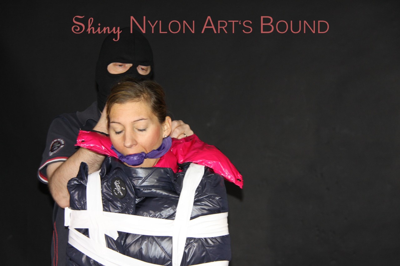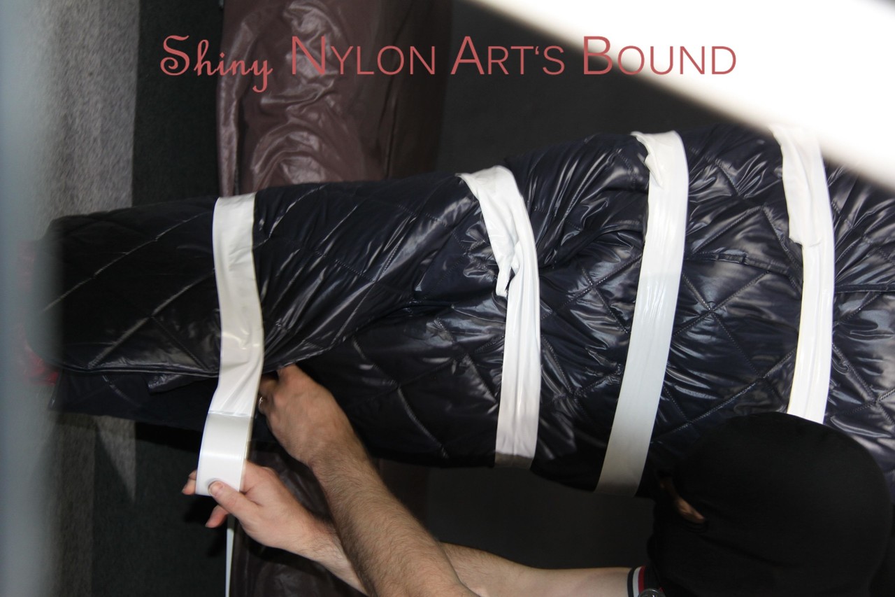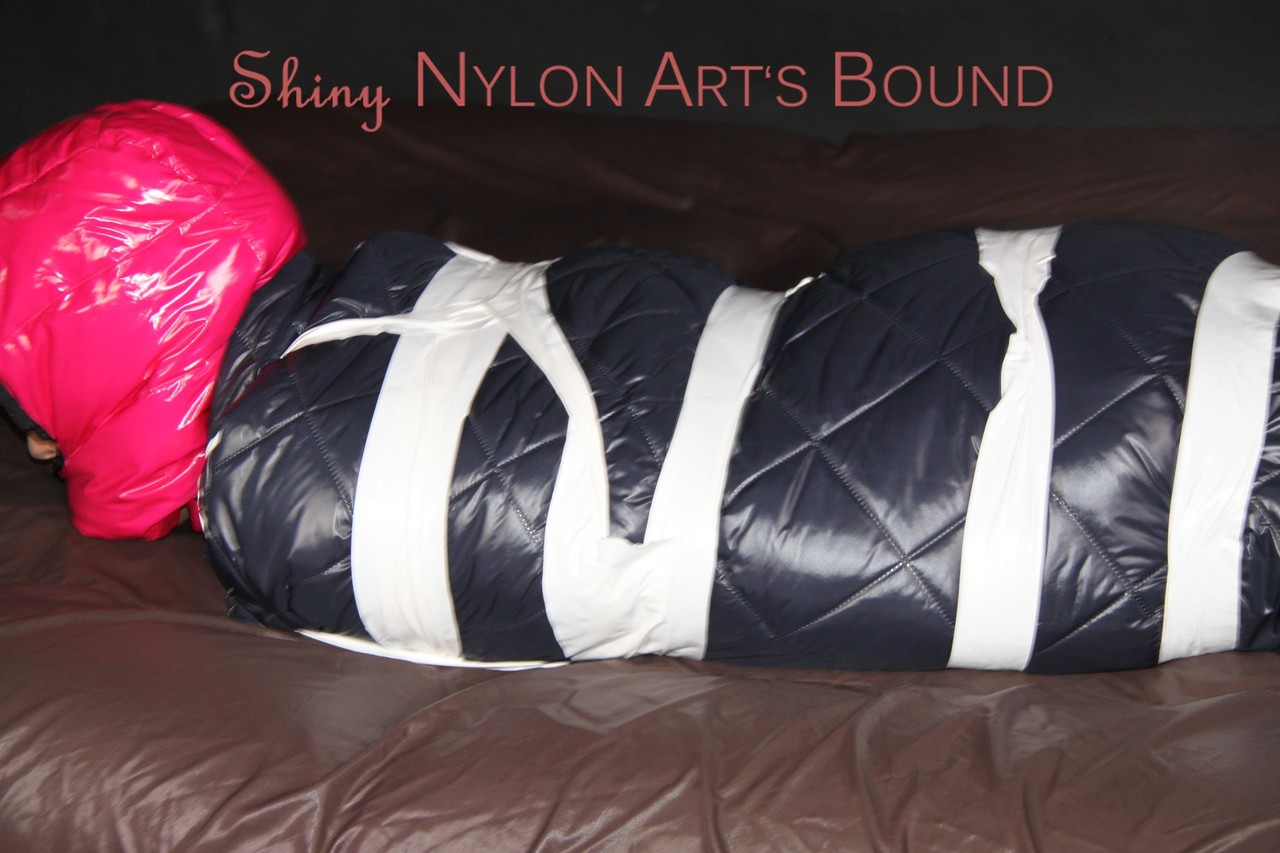 Home BDSM White Girl Bound In Down Cover And Nylon Jacket