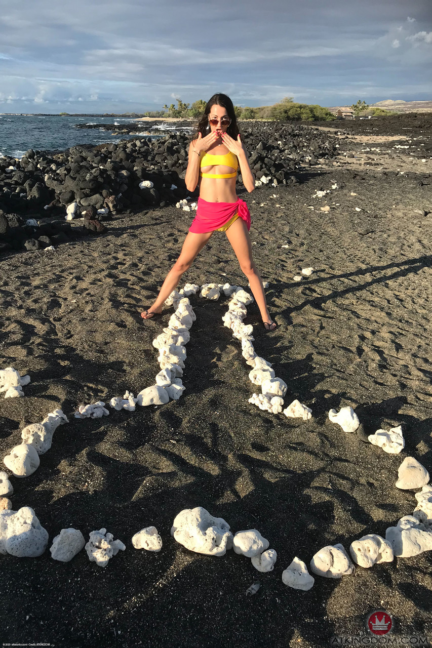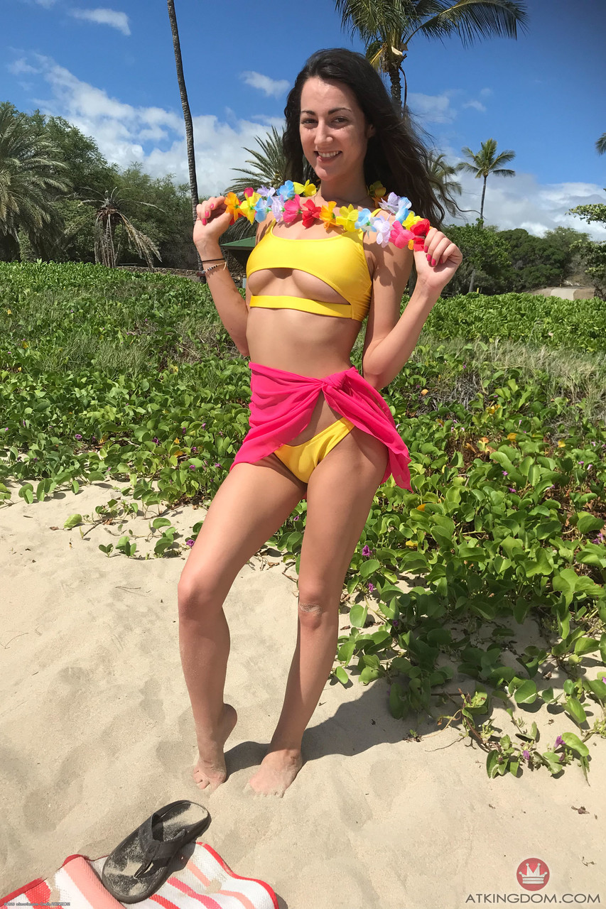 Lily Adams teases in tight bikini, flashing cameltoe and open legs on beach—amateur teen girlfriend shows off big booty, natural tits, and sexy feet before step-sister joins.