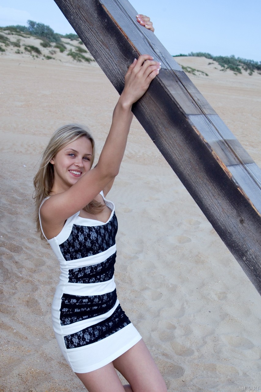Blue-eyed teen Luciana A flaunts natural tits and shaved pussy on beach, upskirt no panties under short dress.