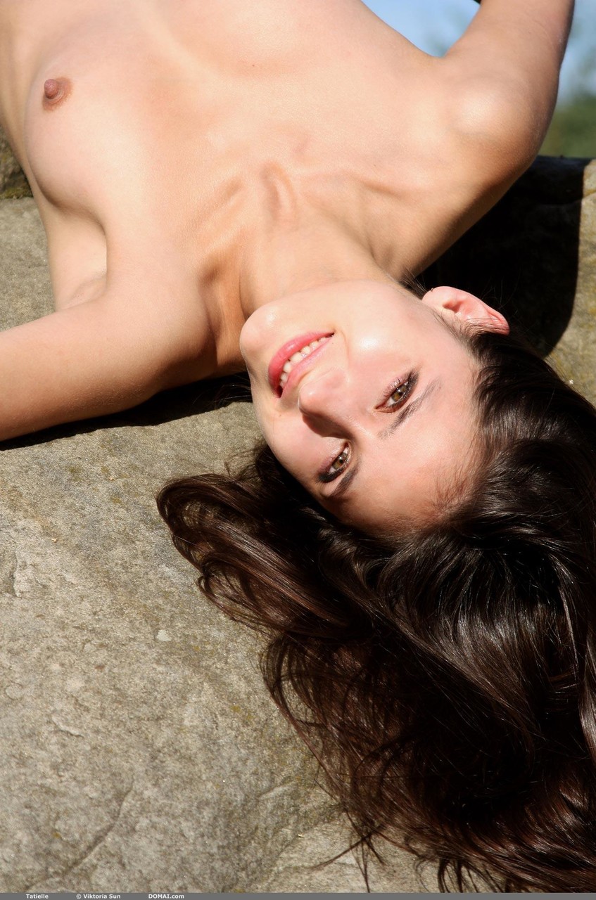Domai unveils skinny teen Tatielle flaunting tiny tits, stiff nipples and tight ass in high-heel outdoor tease—beautiful brunette babe serves pure erotic art.