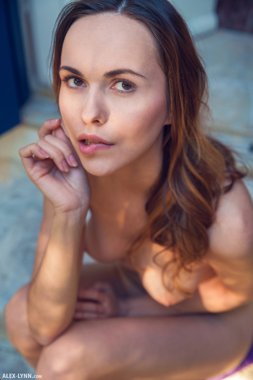 Teen glamour brunette babe strips on balcony, beautiful model spreading to show firm tits in cute solo scene
