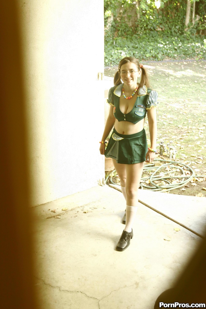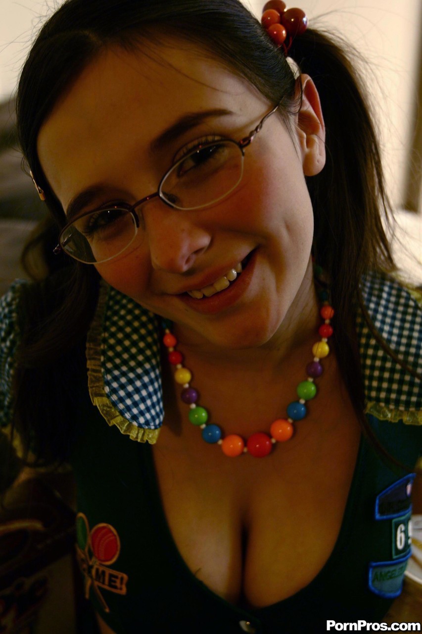 Adorable nerdy teen Angel Jay spreads outdoors for a monster cock ride, strokes shaft with her glasses on, and takes a hot facial cumshot.