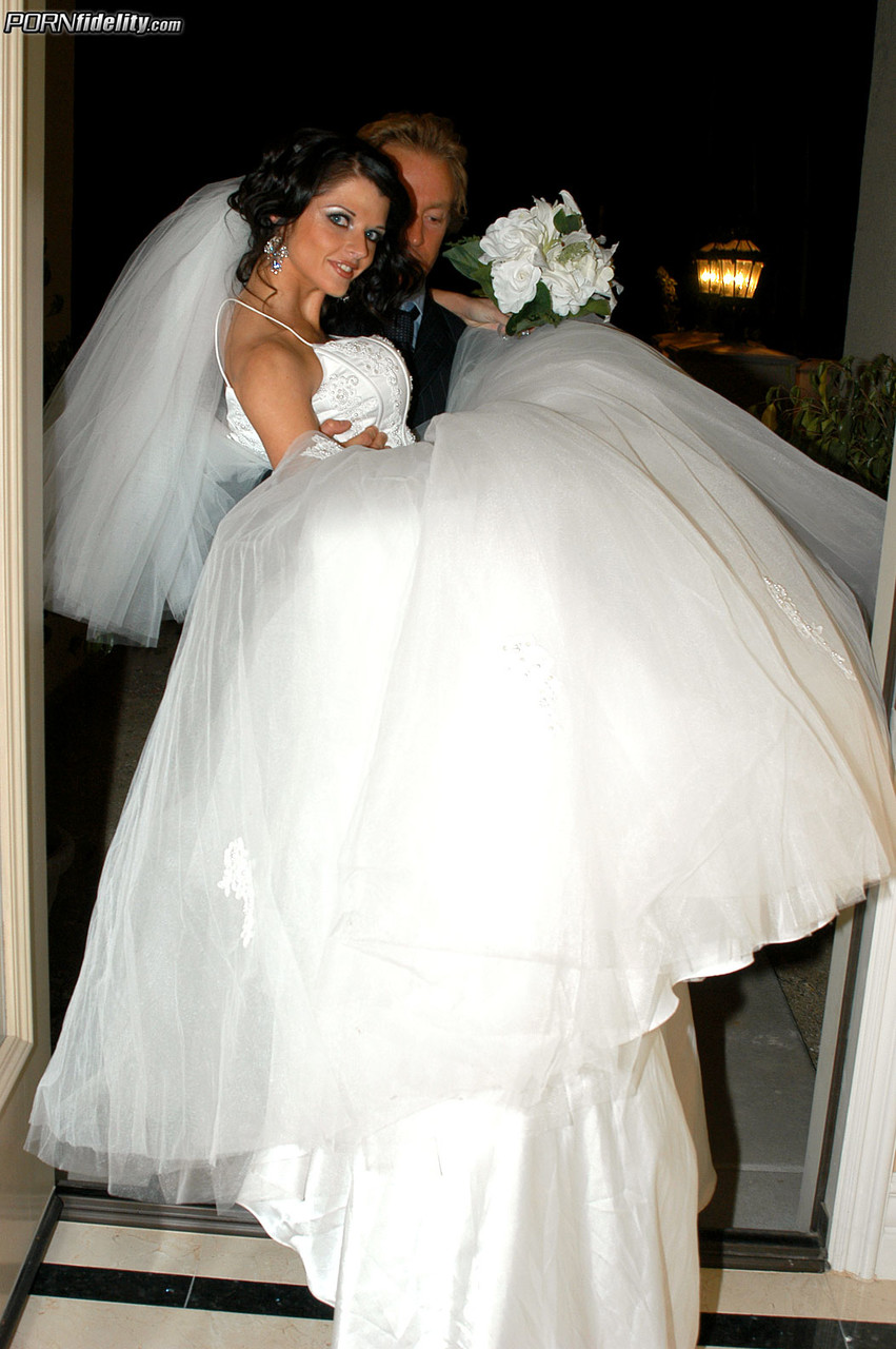 Brunette bride Joslyn James shows off her big fake tits and rides hard for a wedding-night creampie in this steamy MILF gallery.