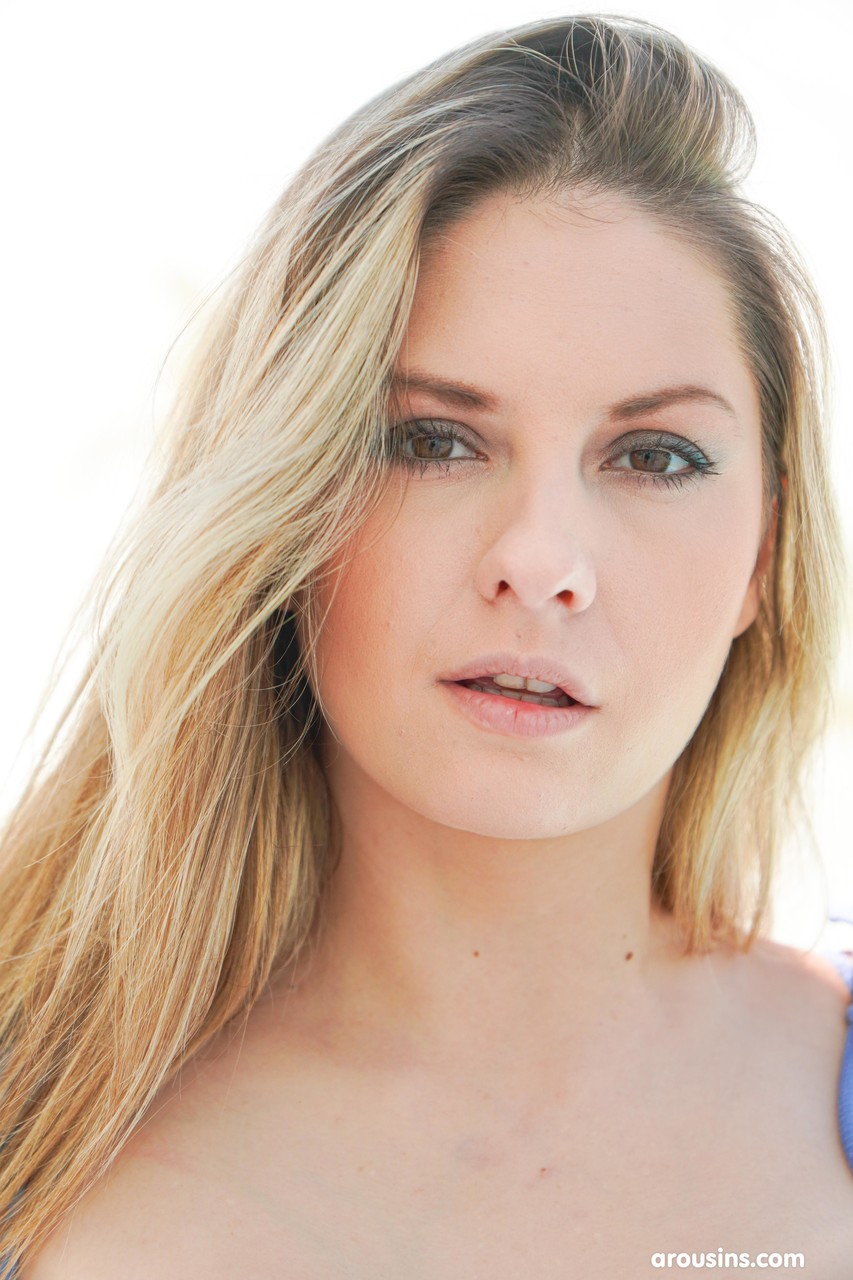 White blonde babe Rebecca Volpetti strips bikini poolside, unveiling juggs and round ass in steamy solo glamour shoot.