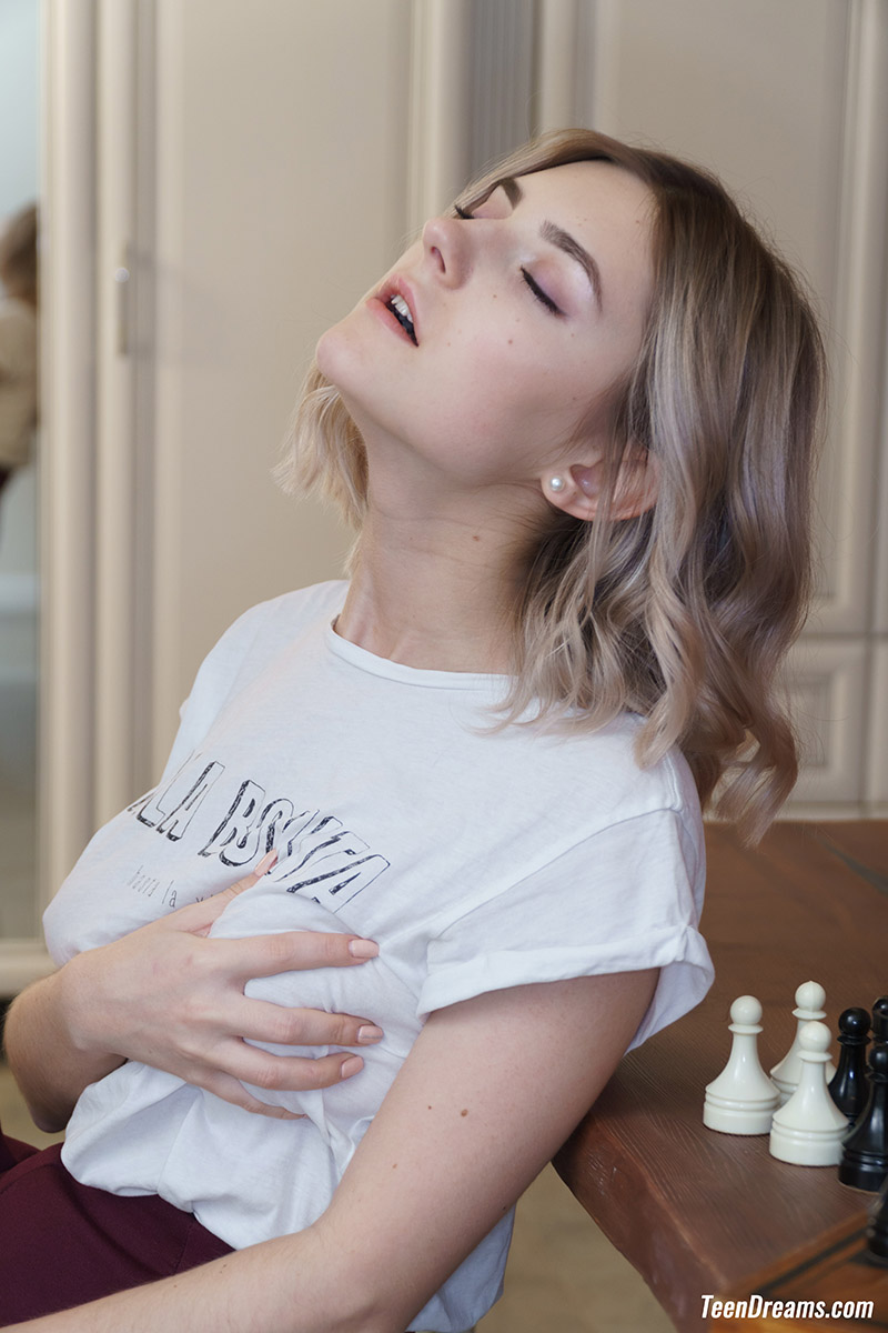 Blonde teen Eva Elfie strips nude after chess, flashing upskirt panties, spreading skinny pussy, fingering her tight teen hole with big natural tits out.