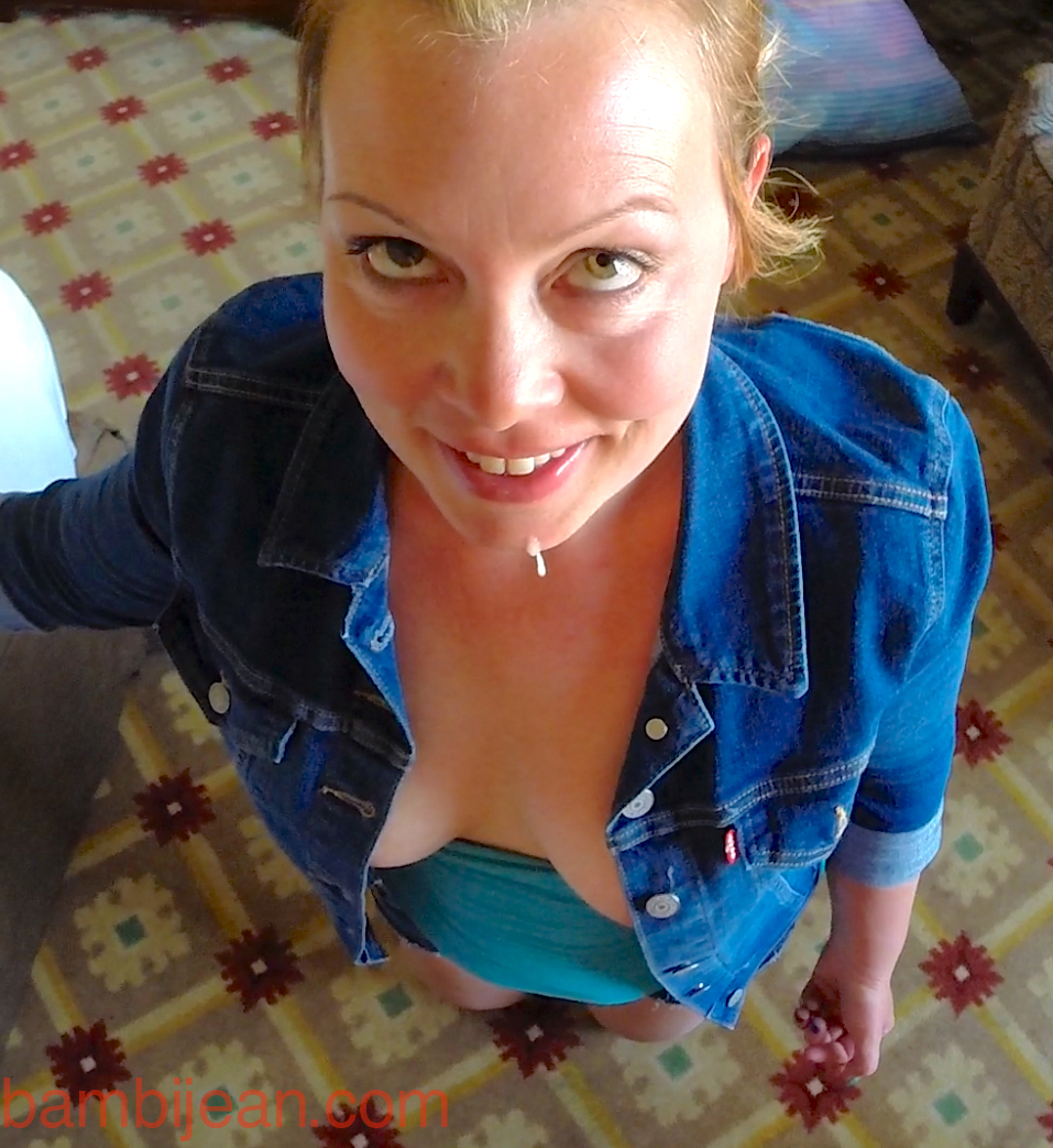 Bambi Jean delivers amateur blonde blowjob and handjob action, ending with huge cumshot on her clothes—deepthroat, ahegao, and clothed tease in every frame.