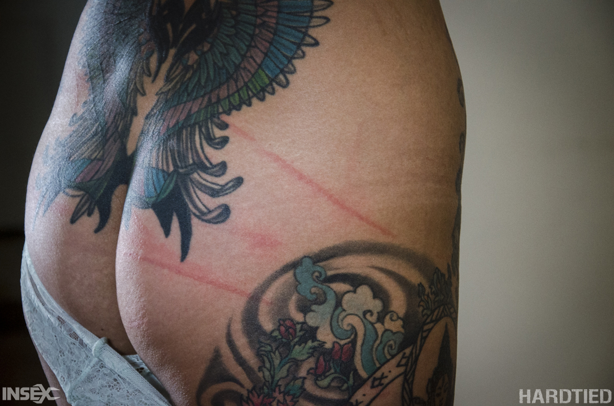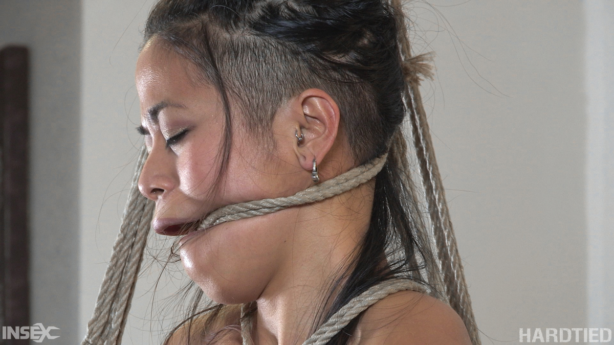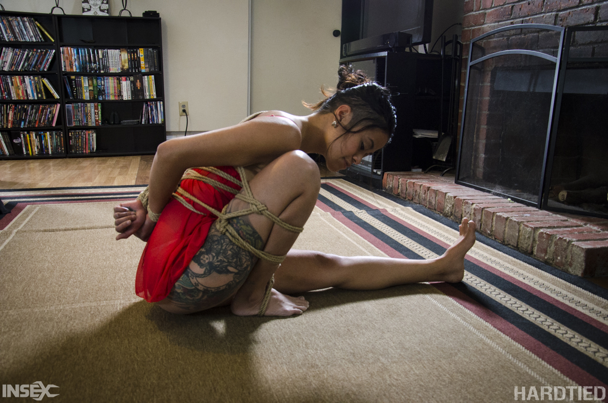 Tattooed Asian babe Chillycarlita bound in rope, struggling against tight restraints. Watch her shaved pussy and ass exposed in close-up bondage action.