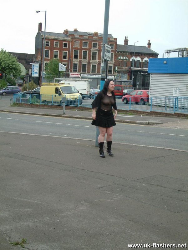 Dark-haired BBW flaunts big tits under a see-through top, flashing curves in public wearing a skirt, boots and glasses—clothed tease for chubby, curvy and brunette lovers.