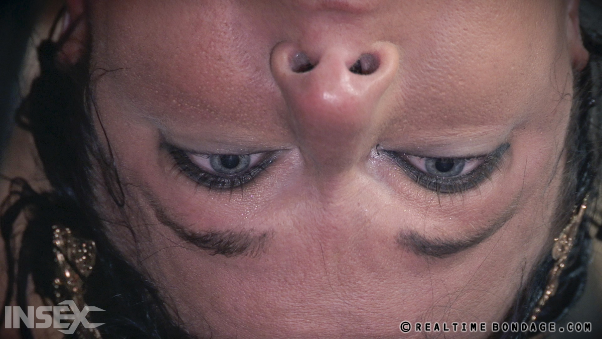London River endures painful BDSM bondage, saggy tits hanging as her shaved pussy is spread close-up; brunette submissive faces intense clips and feet tease in raw fetish session.