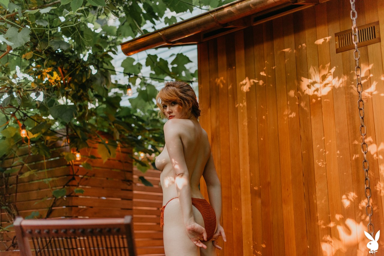 Glamorous redheaded babe Amber Rose strips outdoors, washing her curvy centerfold body in a steamy solo glamour shoot.