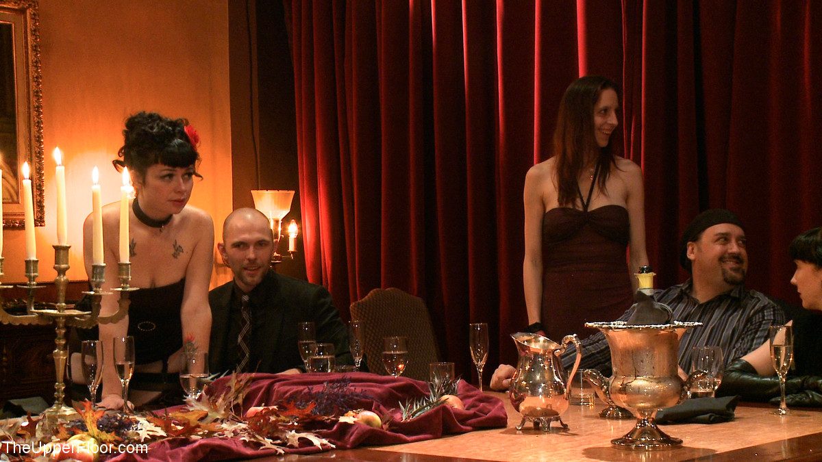 Curvy redhead MILF Bella Rossi submits to bondage and BDSM on The Upper Floor, her chubby body in stockings dominated by Jack Hammer and James Hot.