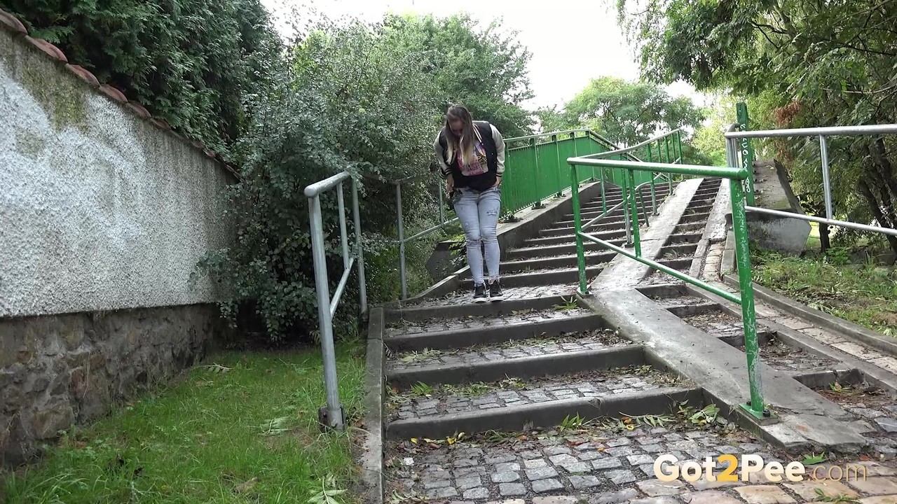 Naomi Benet's public pissing escapade, showcasing beautiful European babe in jeans, up close.