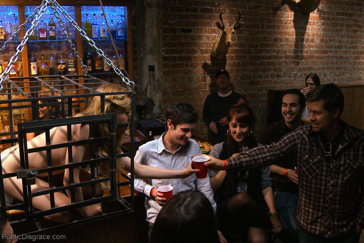 Emma Haize and John Strong star in a steamy public BDSM gallery packed with bondage, strapon, and lesbian action—skinny blonde gets disgraced in prison.