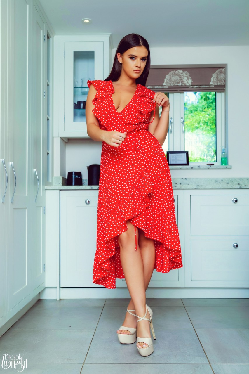 Gorgeous UK teen Brook Wright strips her pretty dress to reveal killer body, long legs and natural big tits in high heels and short skirt, teasing naked in kitchen.