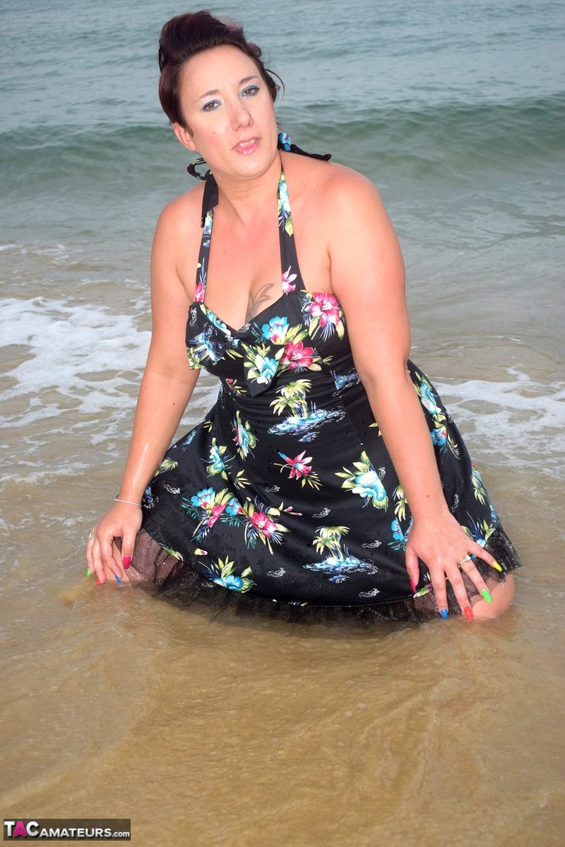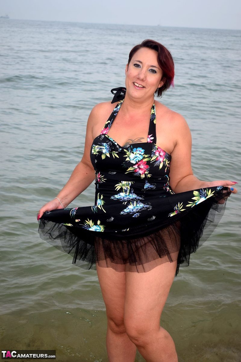 Sara Banks, curvy mature BBW, teases in wet skirt on beach, spreading thick thighs for public upskirt peek at granny pussy.