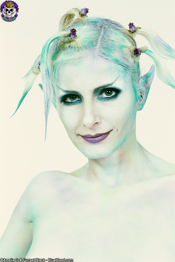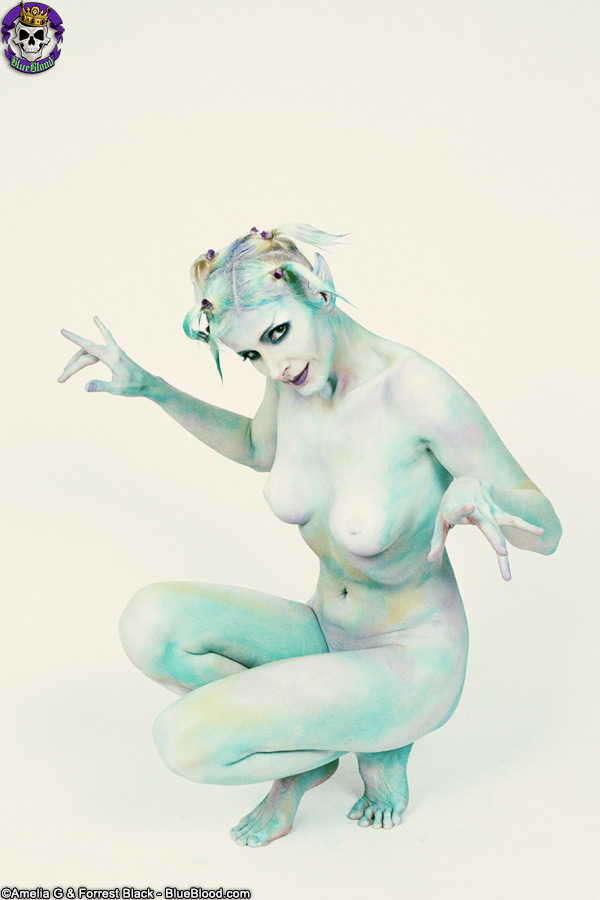 Pale blonde cosplay babe Eve Bennu strips nude during modeling gig, showing off her tiny tits, beautiful face, long legs and shaved pussy in sexy costume.